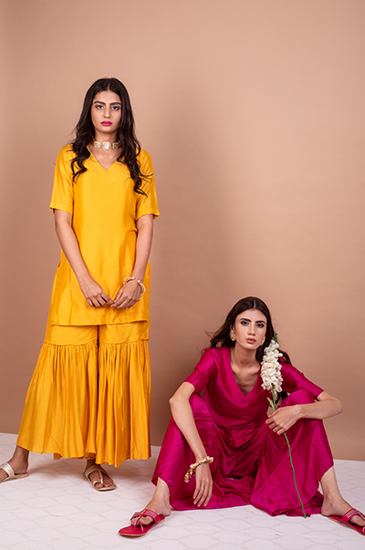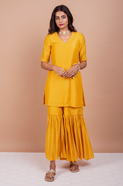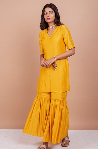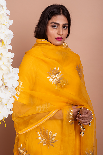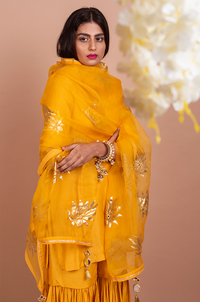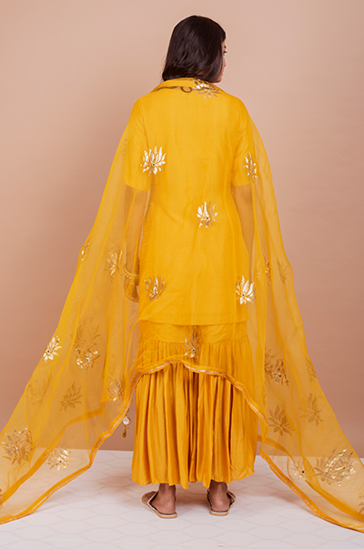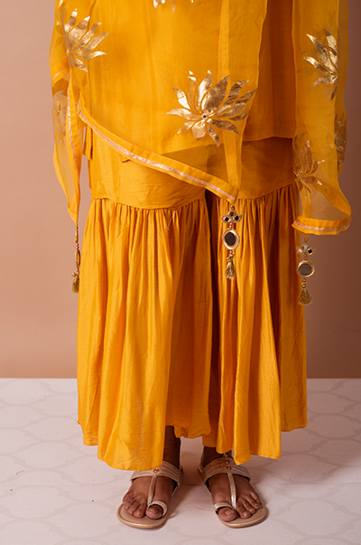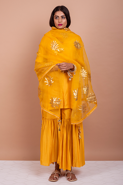 This three piece set includes kurta, Sharara and dupatta. Deep Yellow Kurta with Sharara and Foil Printed Silk organza dupatta with mirror work detailing.