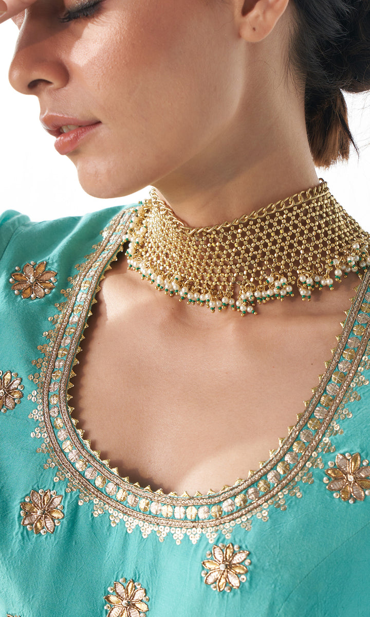 Jahanara Turqoise Gota Embroidered Anarkali With Dupatta and Chooridar - Set of 3