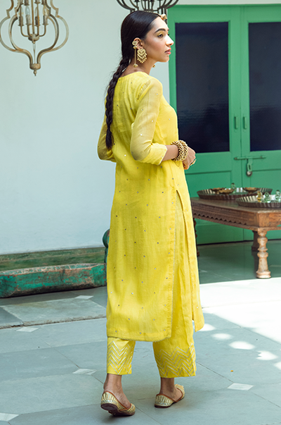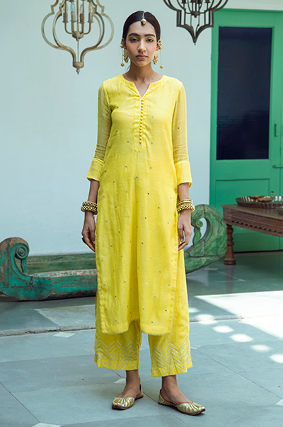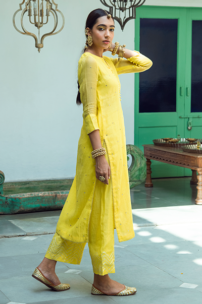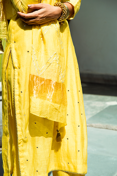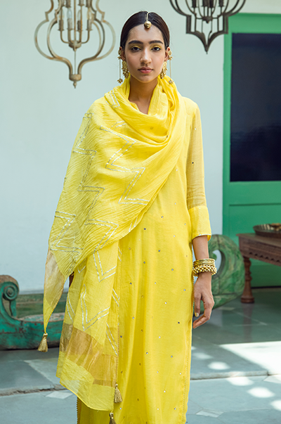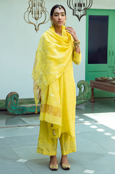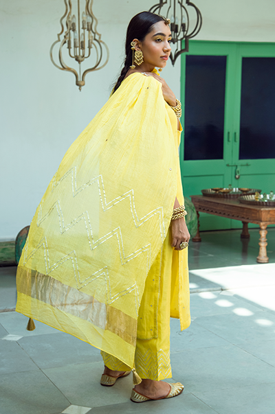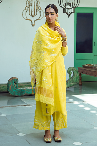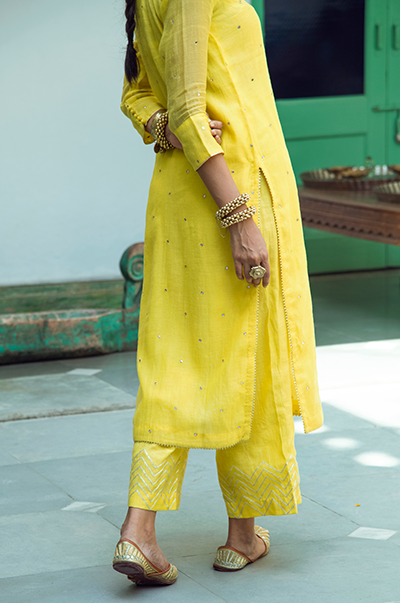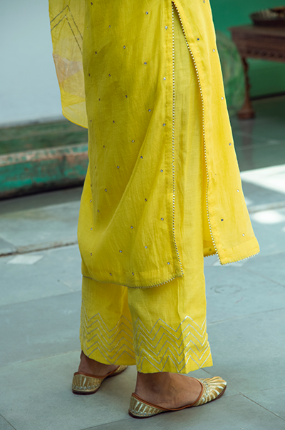 Yellowstraight kurta with gota detailing. Palazzo with gota embroidery. Rani kota chanderi dupatta with gota, tassel finishings.