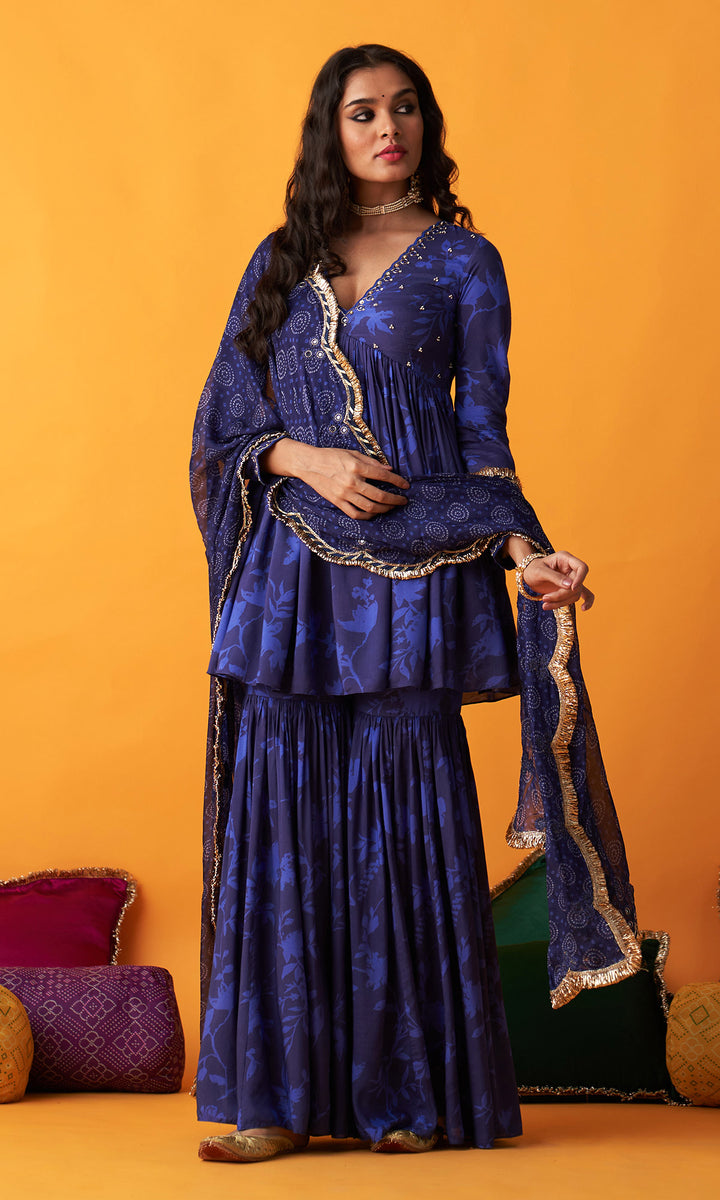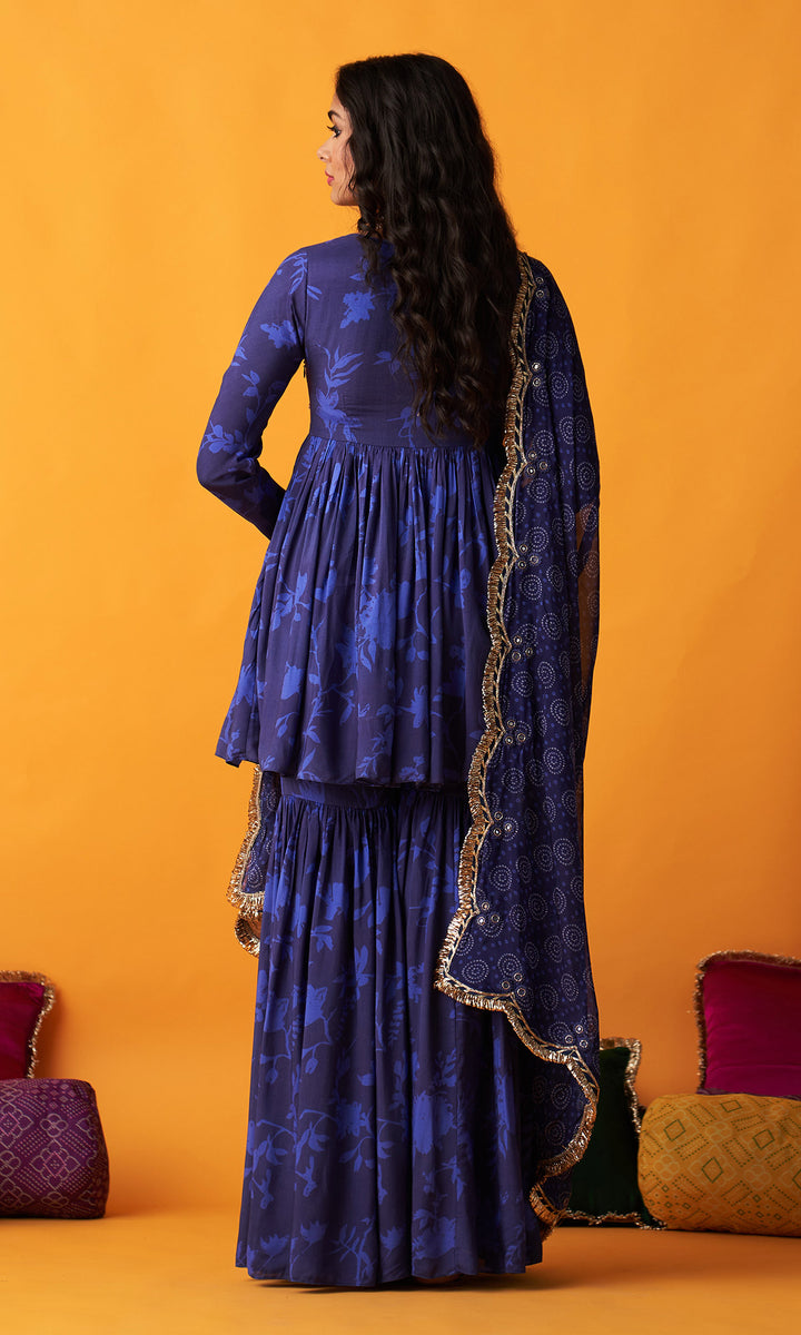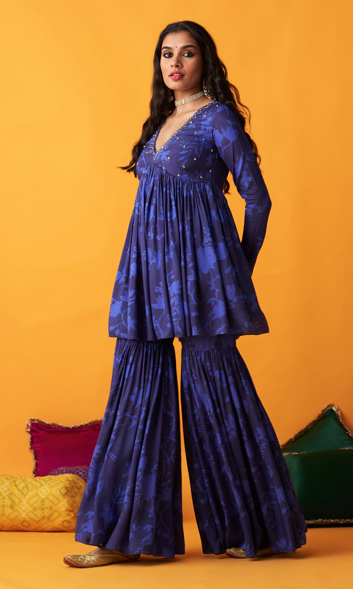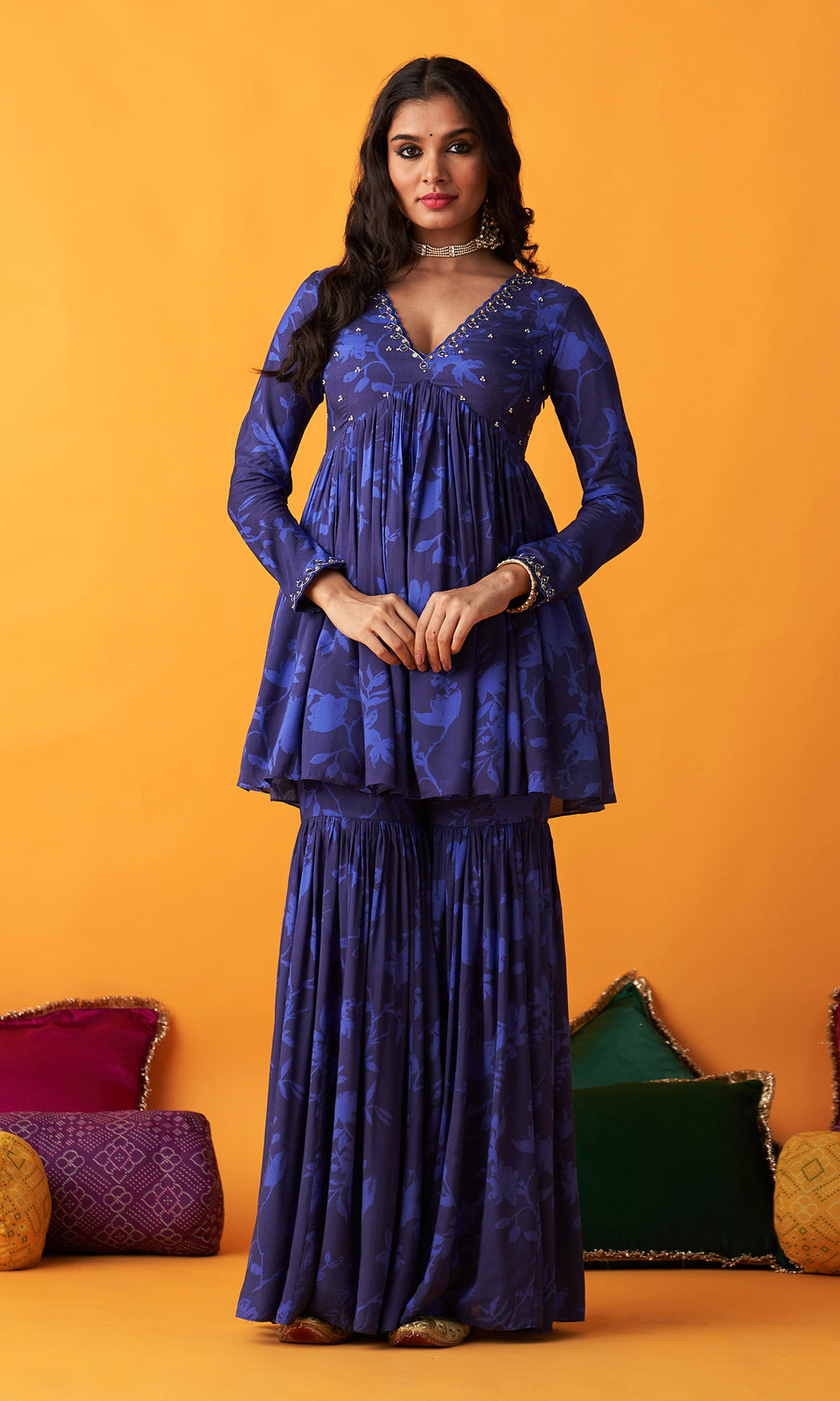 This set includes digital printed V neck Kurta, garara and dupatta. Kurta is embellished with mirror, sequins and Resham work at the neck and sleeve. It comes with digitalprinted garara. Dupatta is detailed with hand embroidery and embellished with lace.