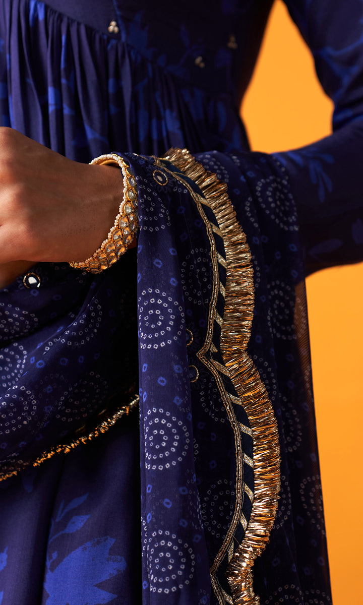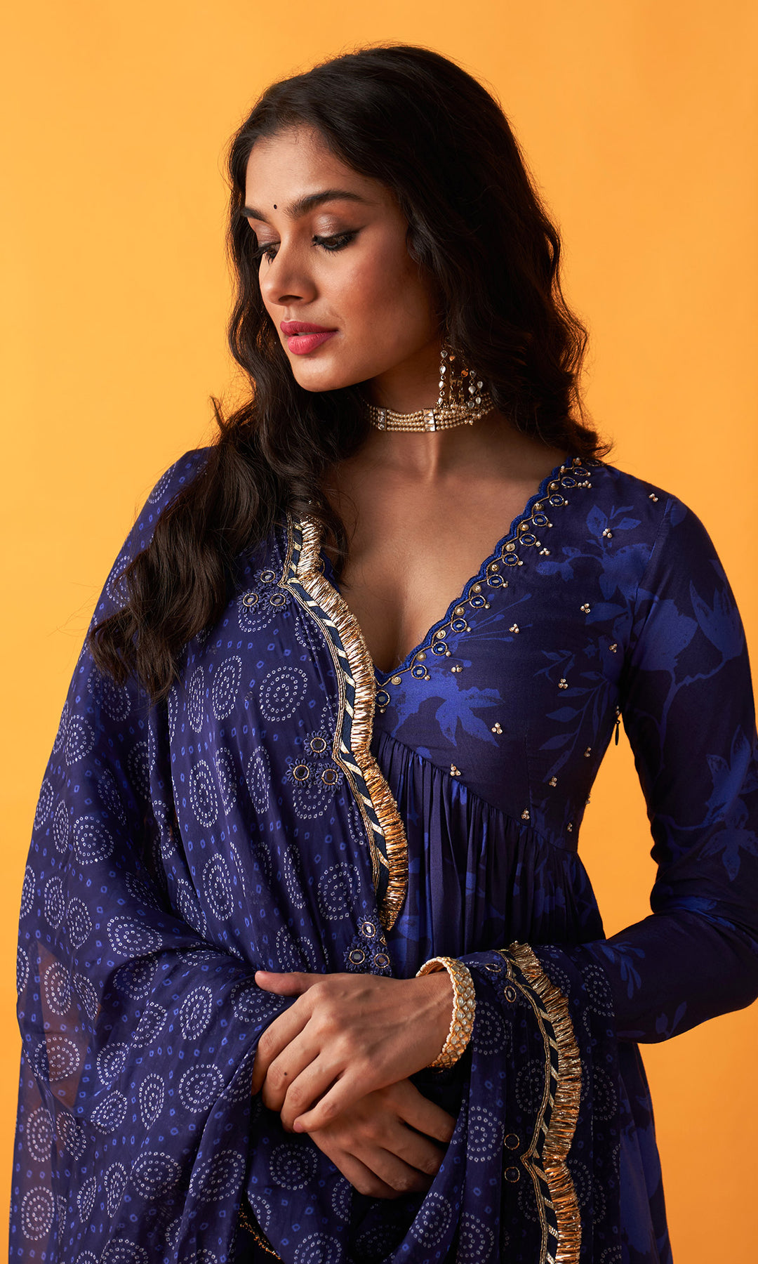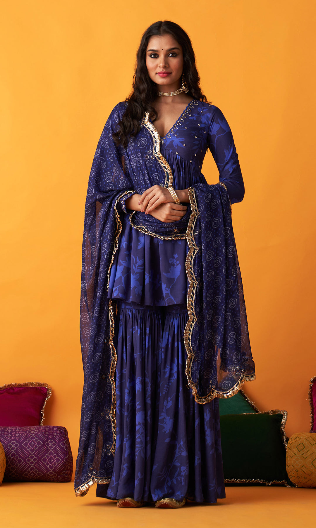 This set includes digital printed V neck Kurta, garara and dupatta. Kurta is embellished with mirror, sequins and Resham work at the neck and sleeve. It comes with digitalprinted garara. Dupatta is detailed with hand embroidery and embellished with lace.