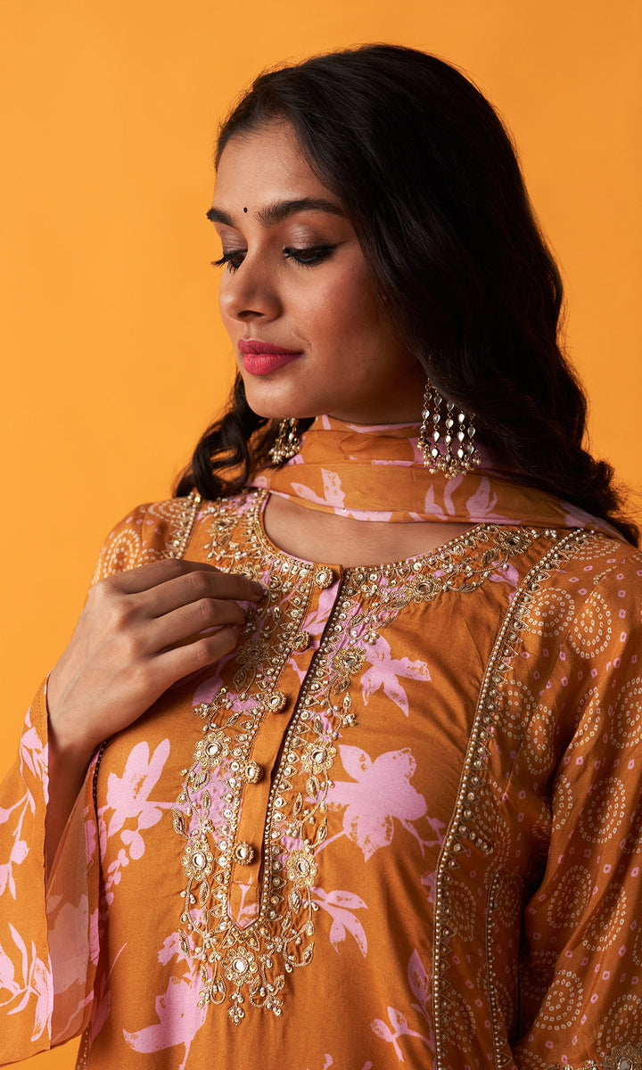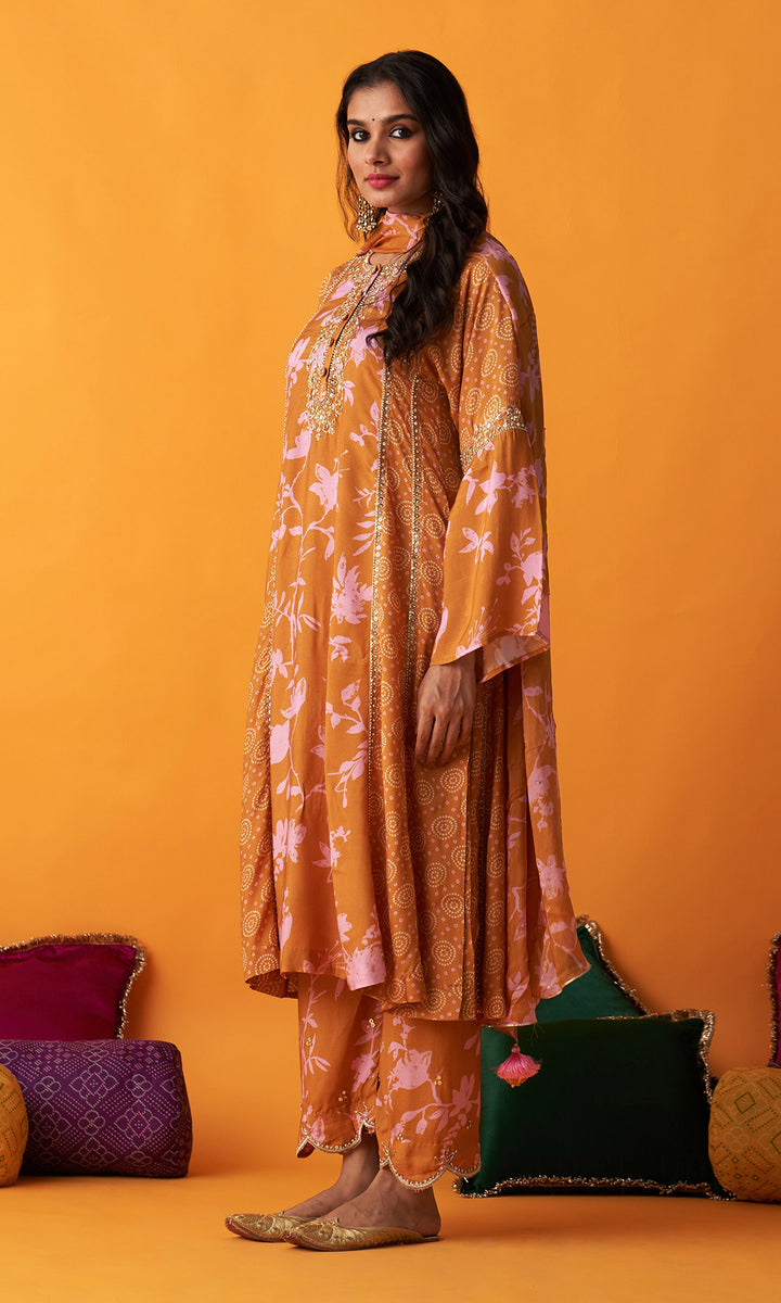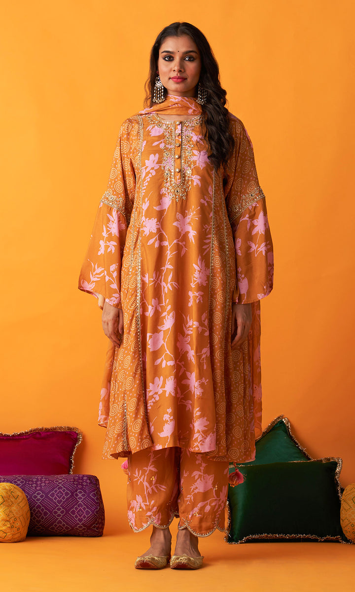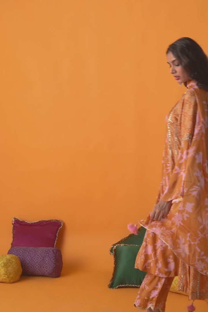 This set includes choga, palazzoand dupatta.Choga embellish aari and hand embroidery with pockets. Palazzo is detailing in hand embroidery. Dupatta is detailed with hand embroidery finish with tassels.