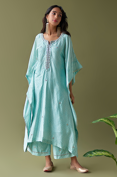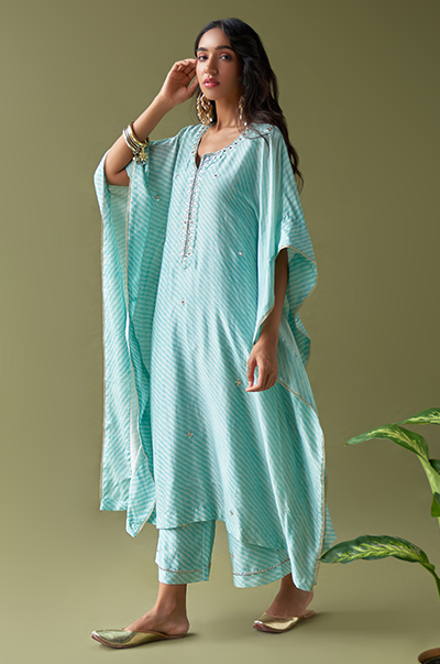 Arctic Blue Lehariya print kaftan with mirror hand embroidery. Lehariya print palazzo with mirror hand embroidery and dabka work finishing.
