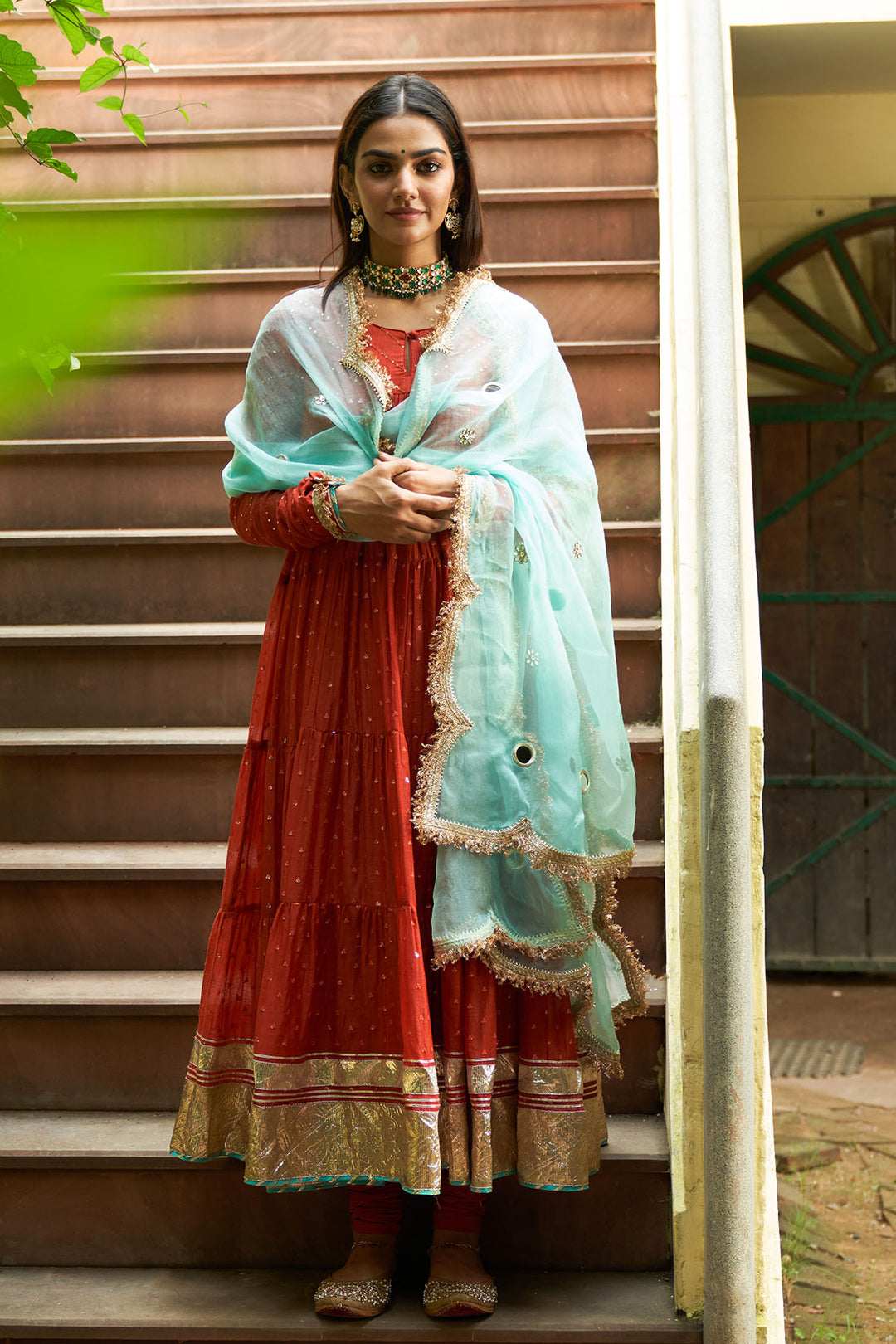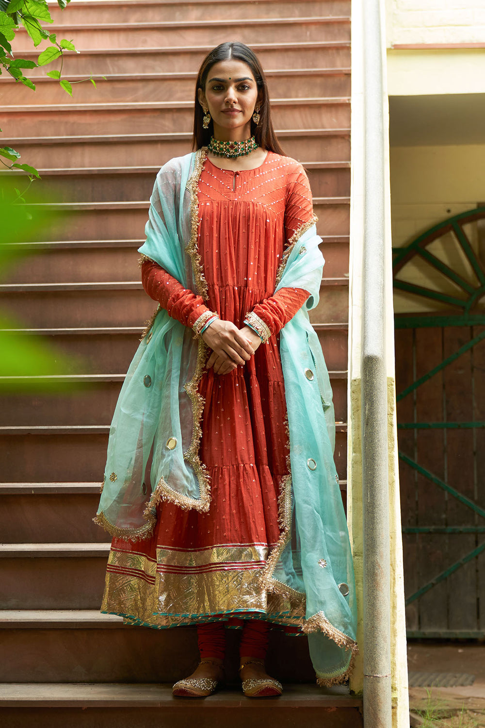 Phillauri Rust Anarkali with Chooridar and Turquoise Dupatta (Set of 3)
