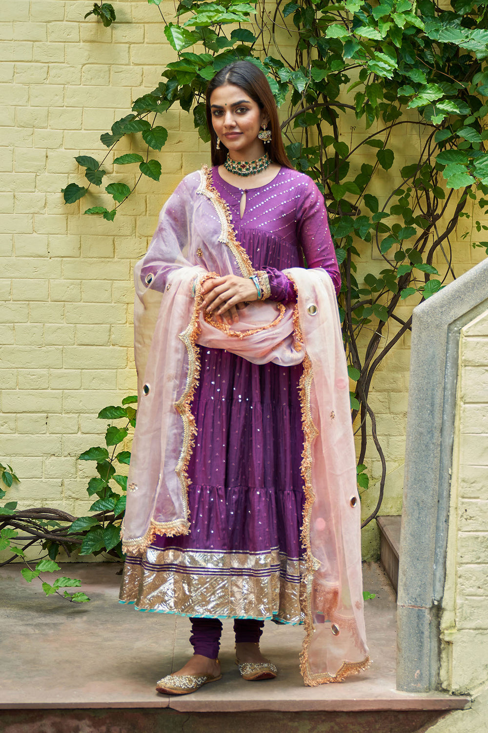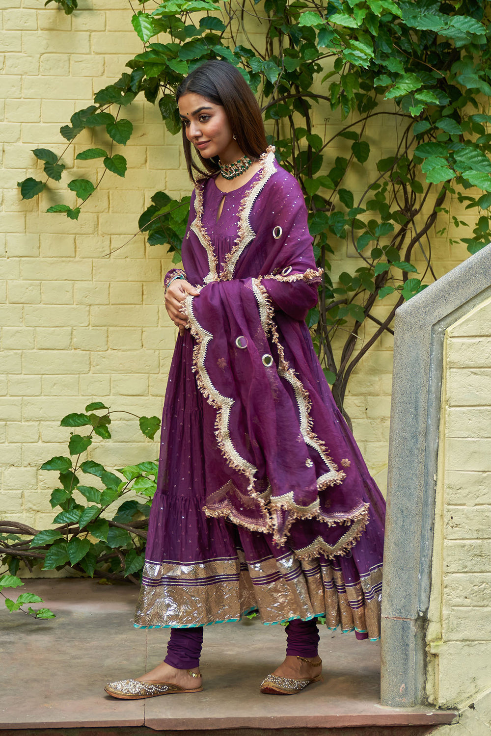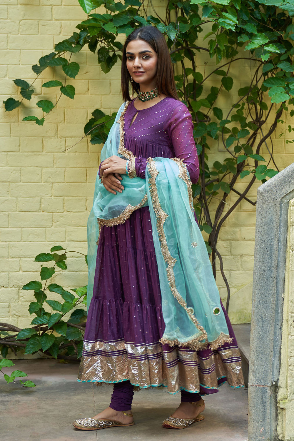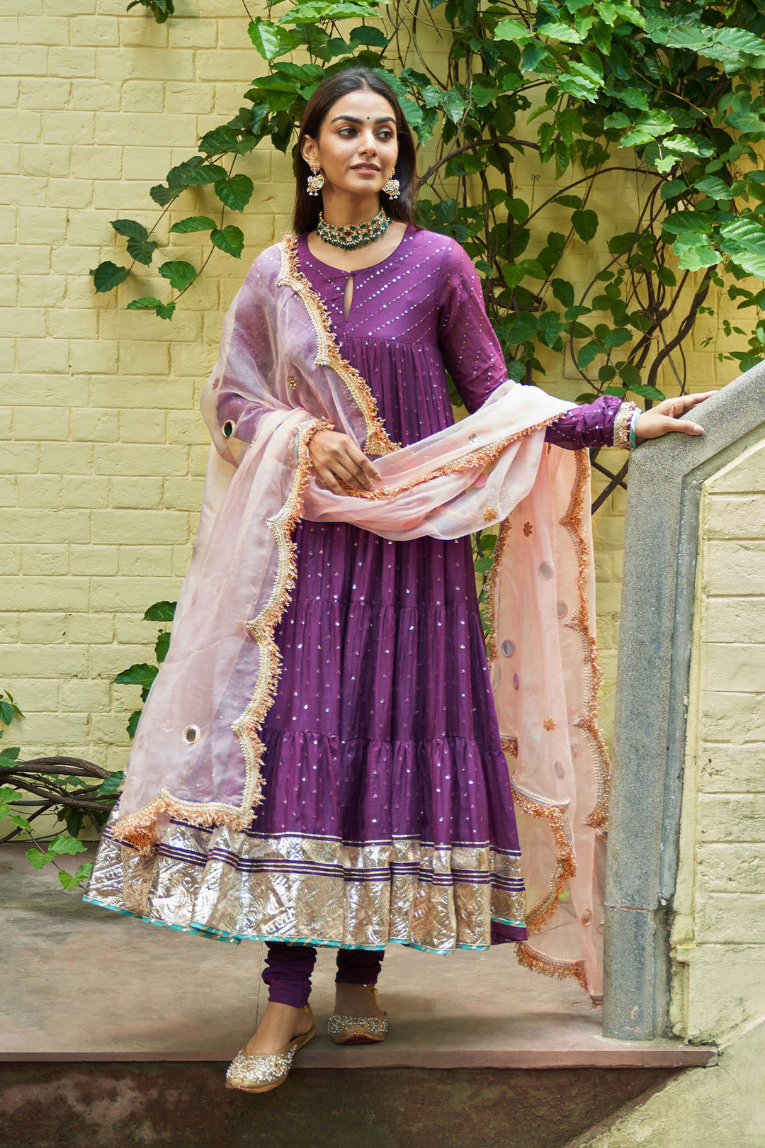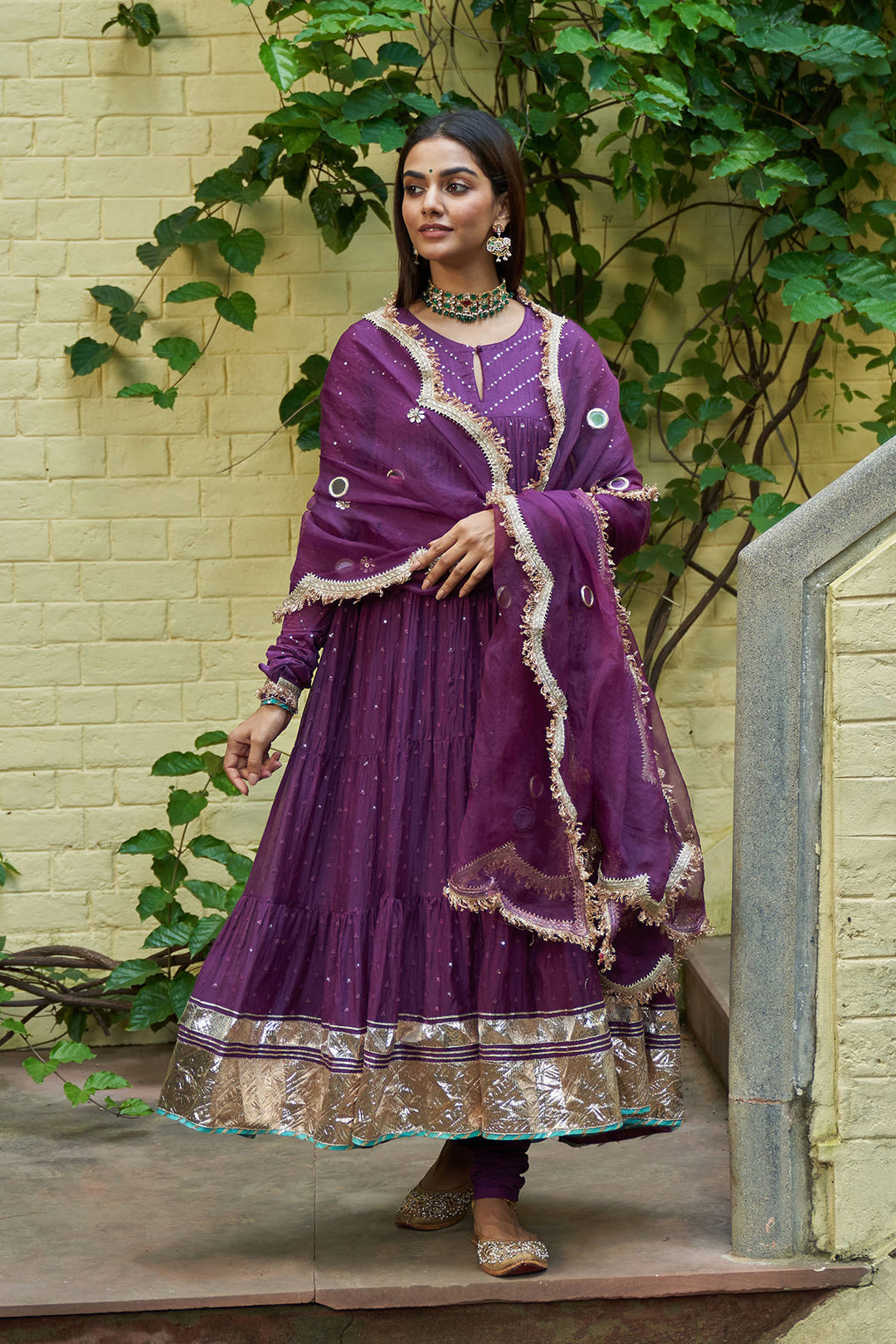Summer Eid'24 - Deep Purple V Neck Anarkali With Embroidered Palazzo And Mughal Buta Dupatta set of 3