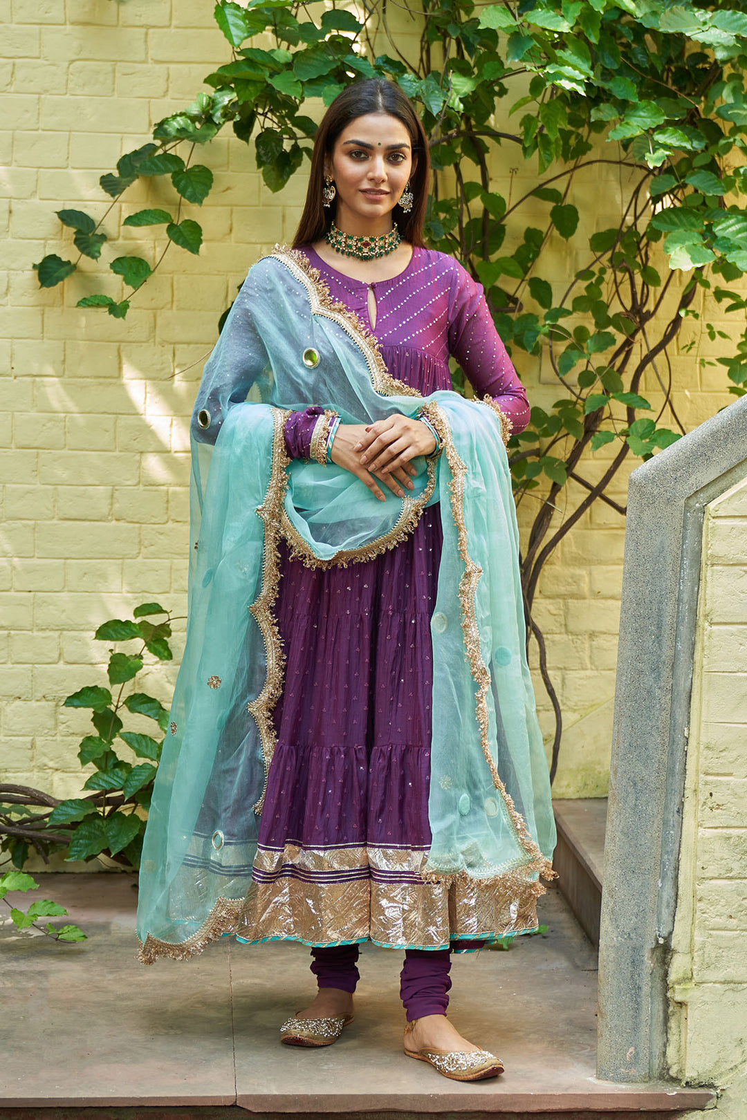 Phillauri Wine Anarkali with Chooridar and Turquoise Dupatta - Set of 3