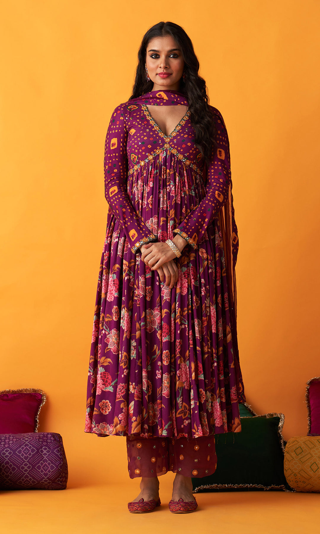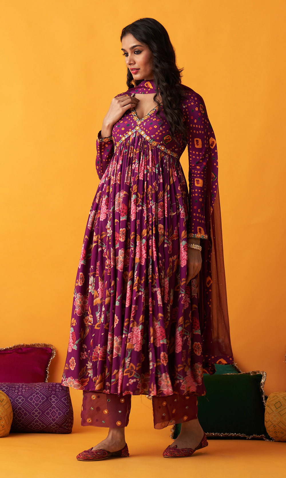 Rangreza 2.0 Bandhani Wine v Neck Anarkali with Solid Palazzo and Mukaish Dupatta (Set of 3)