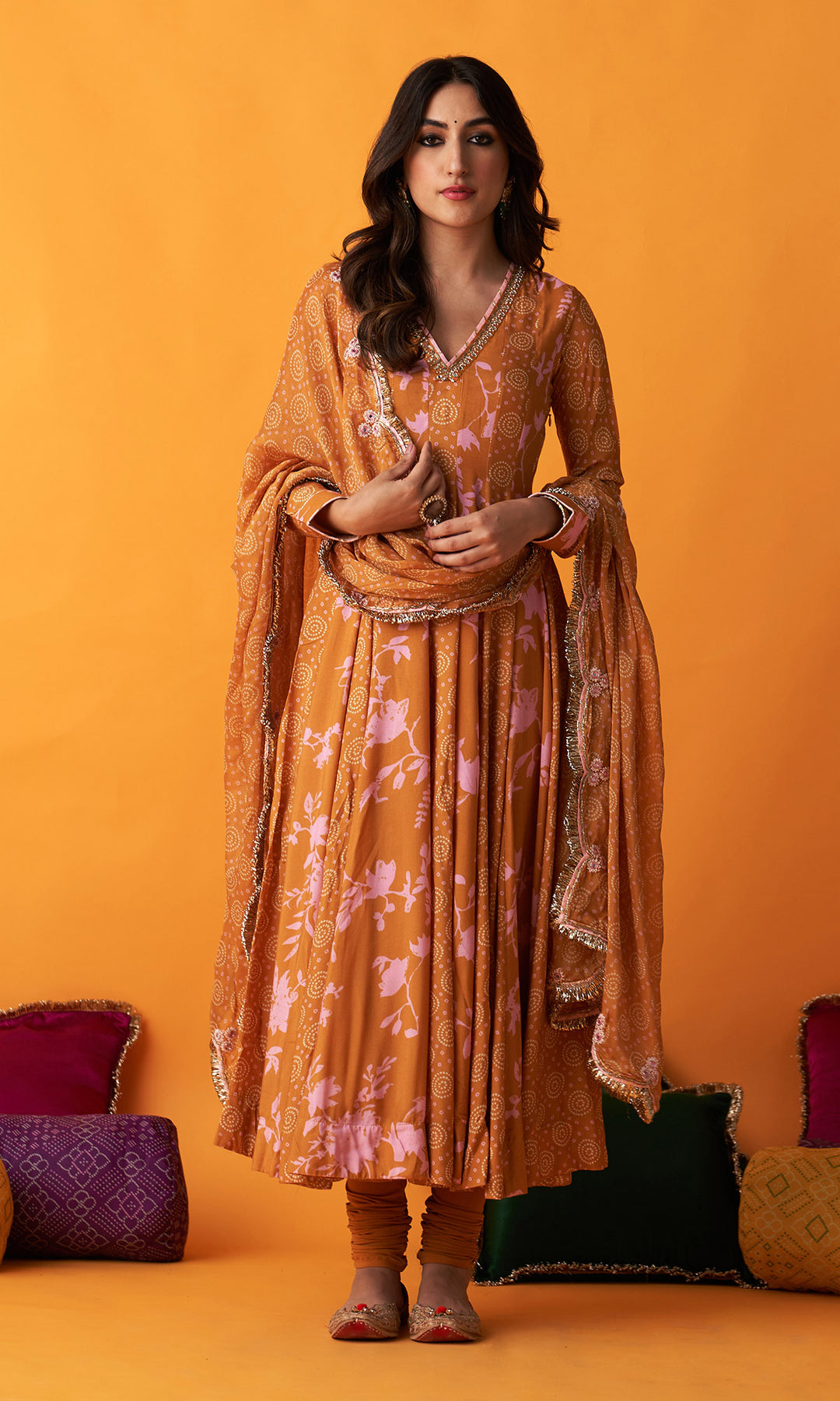 Rangreza 2.0 Bandhani Mustard Anarkali with Chooridar and Dupatta (Set of 3)