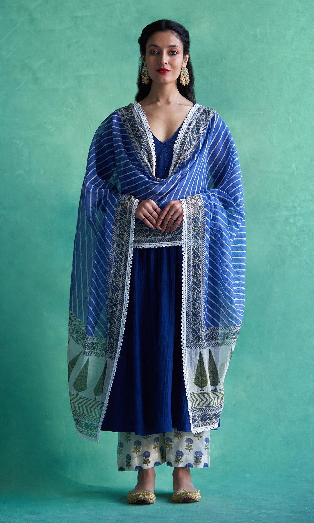 Haseena Blue Leaf Buti Hand Block Print Straight Kurta With Palazzo And Leheriya Dupatta ( Set Of 3)