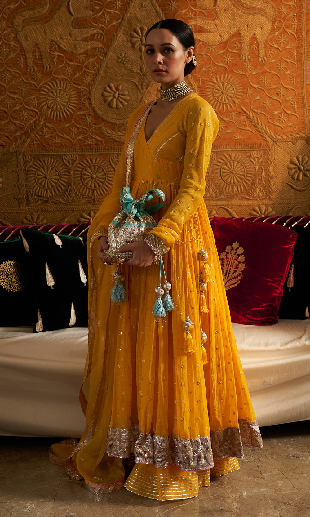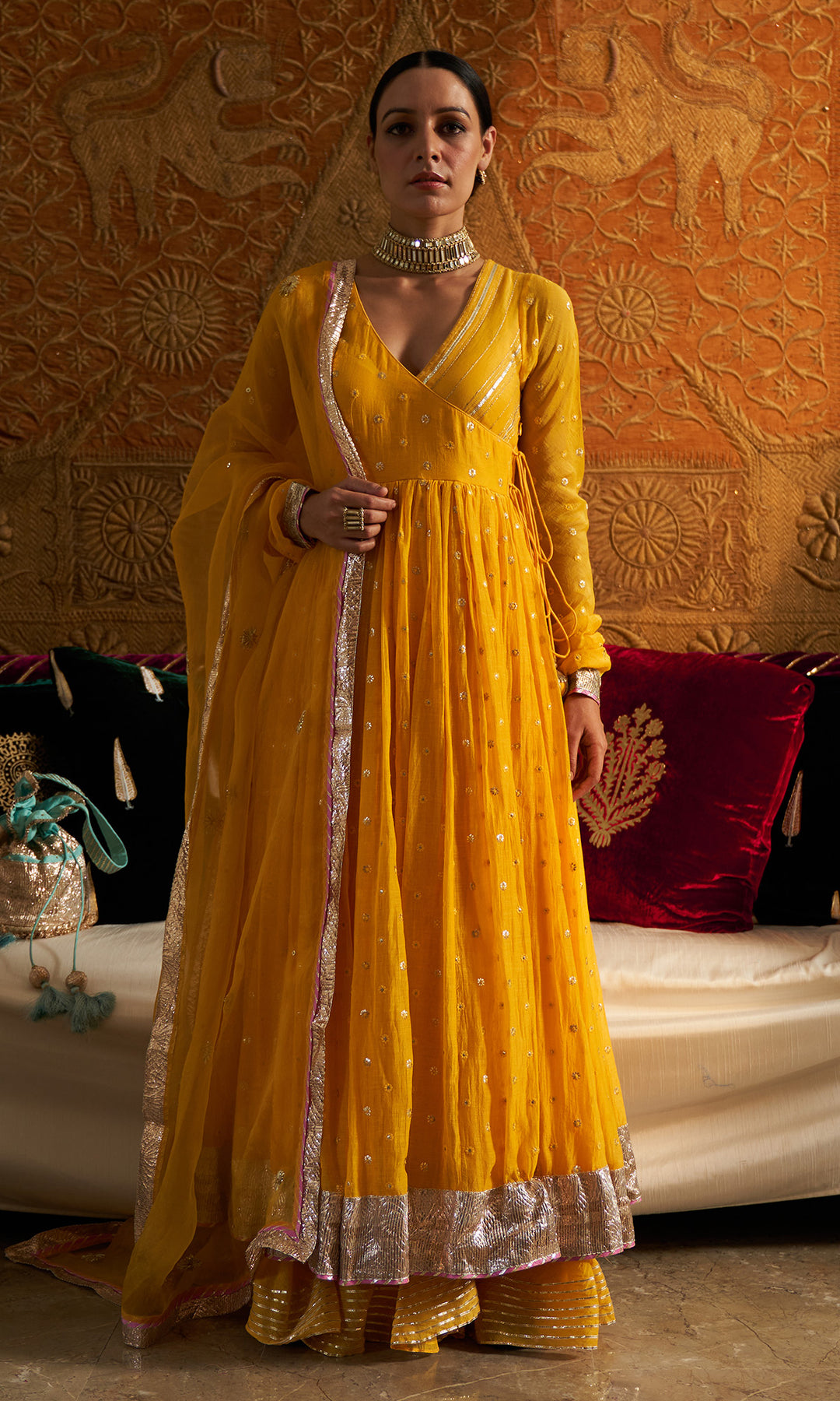 Shivani Raina in Jamaal Yellow Mukaish Chanderi Anarkali with Palazzo and Organza Dupatta- Set of 3