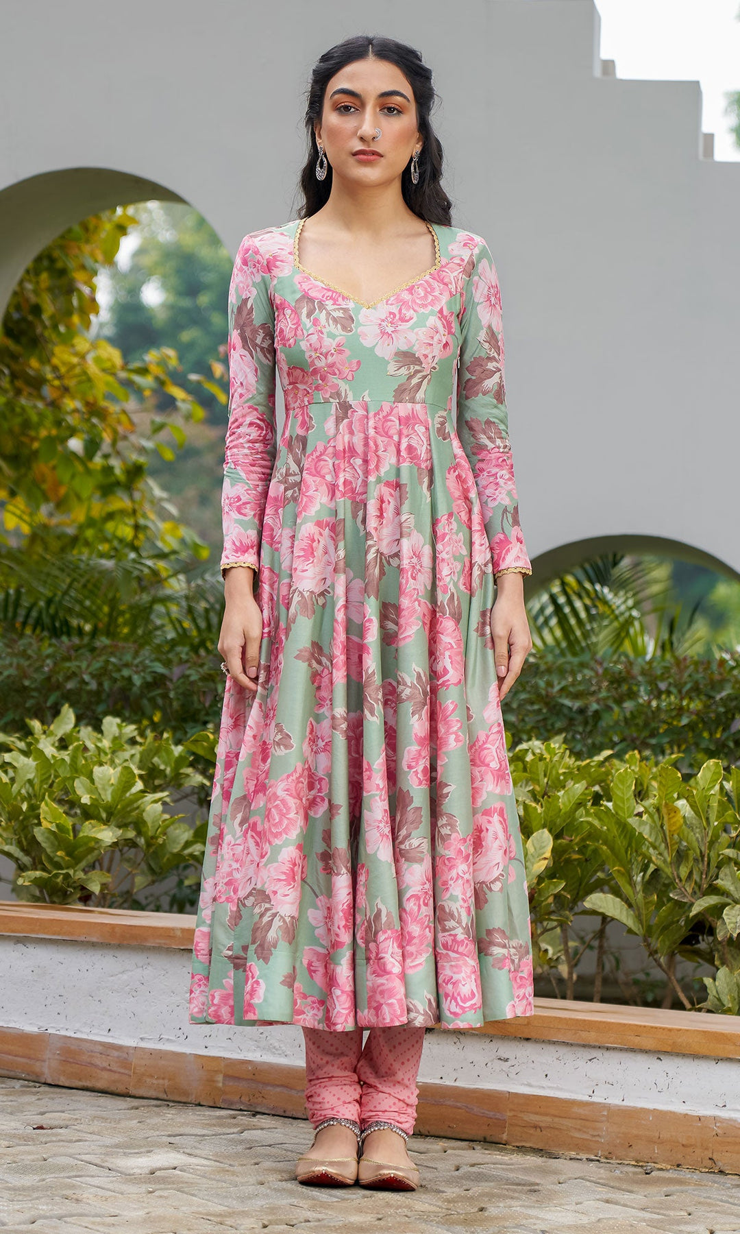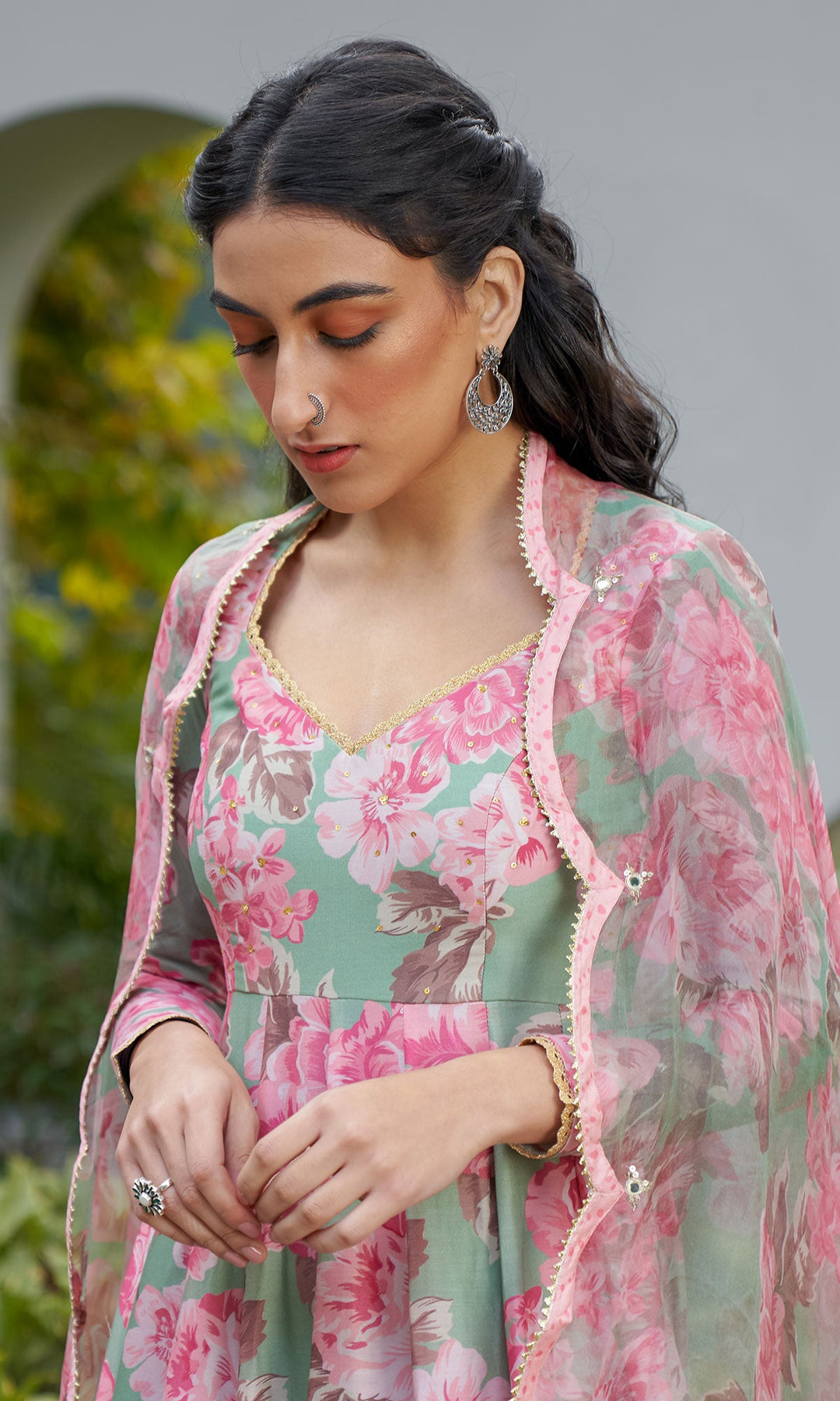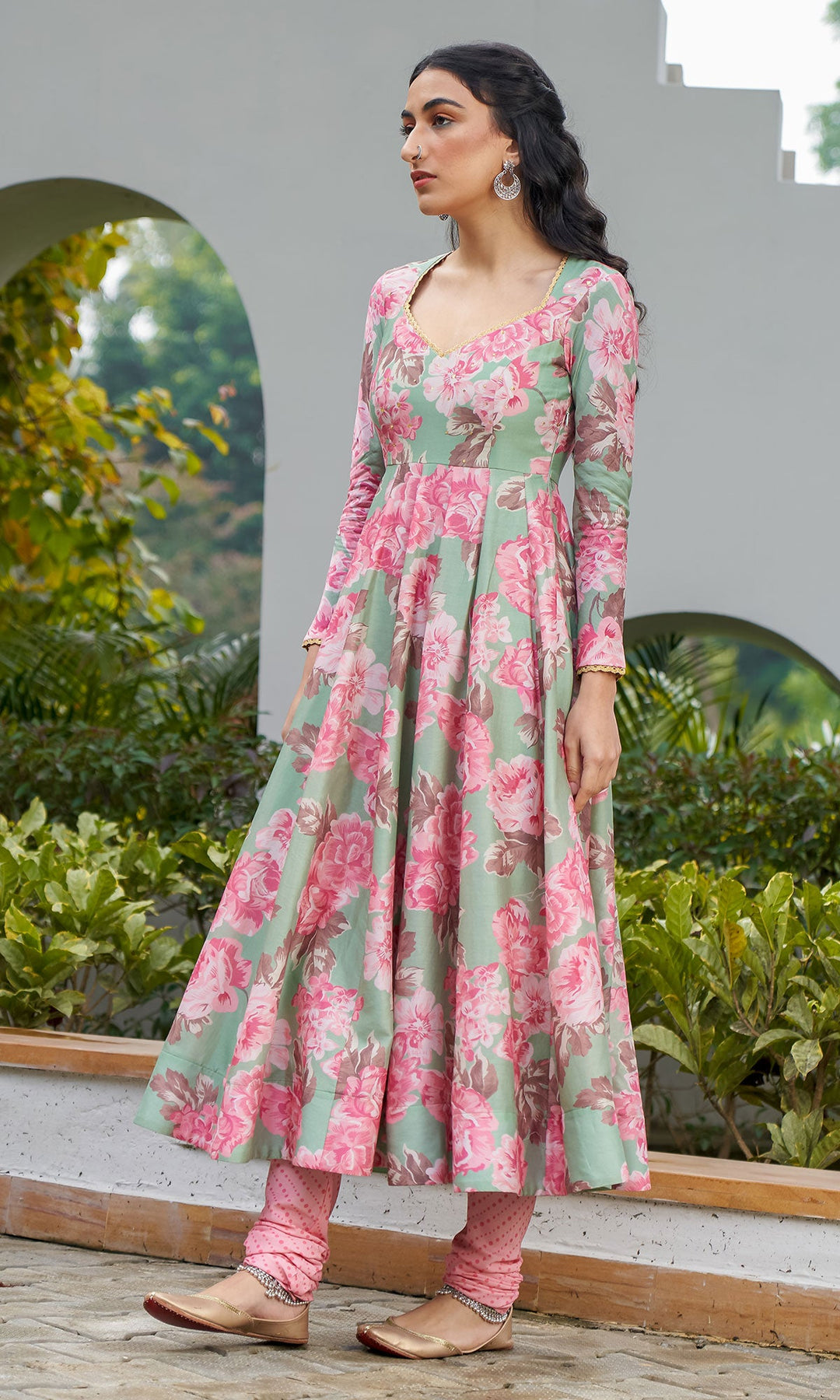 KARISHMA YADAV BHALLA IN AZRA GREEN FLORAL PRINTED ANARKALI WITH CHURIDAR AND DUPATTA - SET OF 3