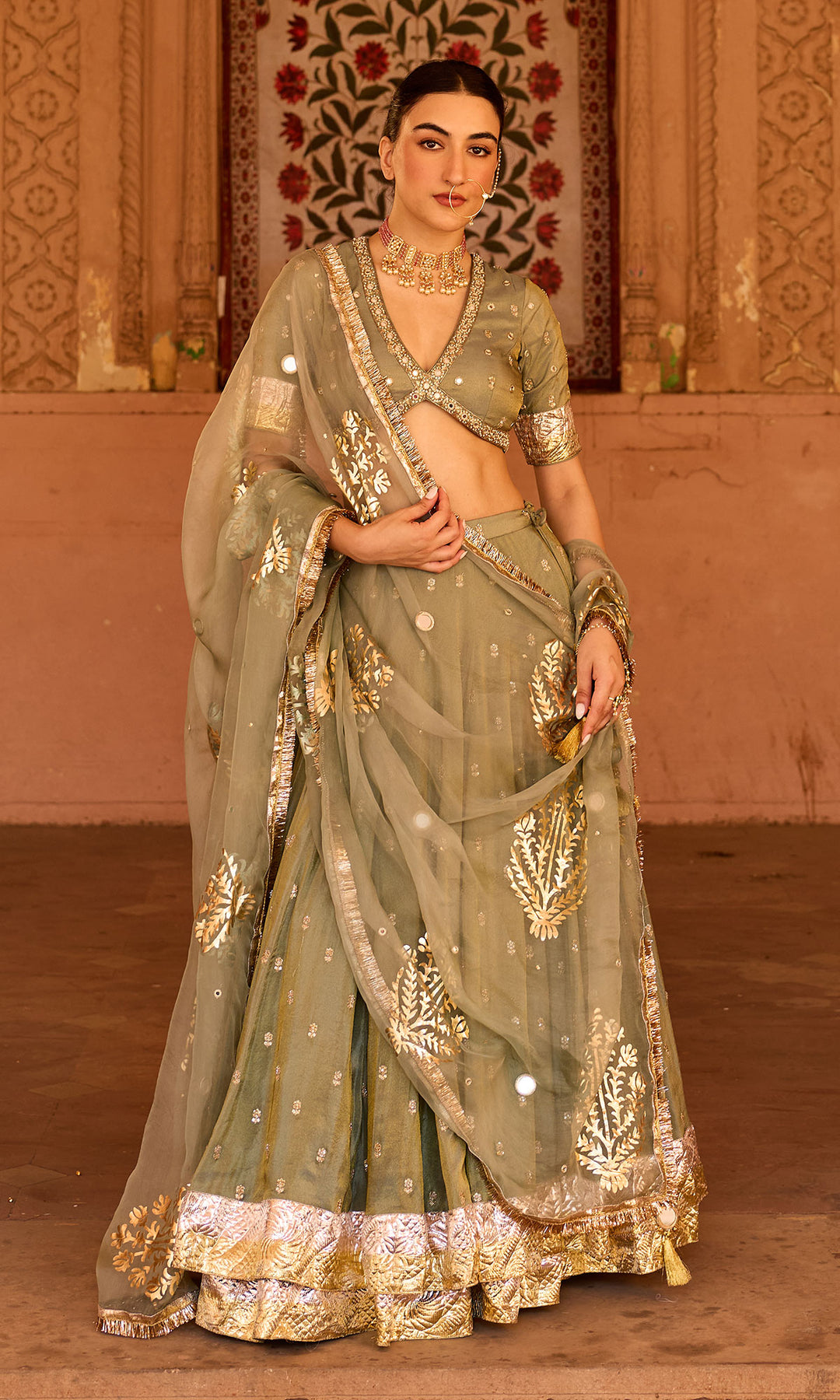 This set includes double layered lehenga with embroidered padded blouse and foil print dupatta.