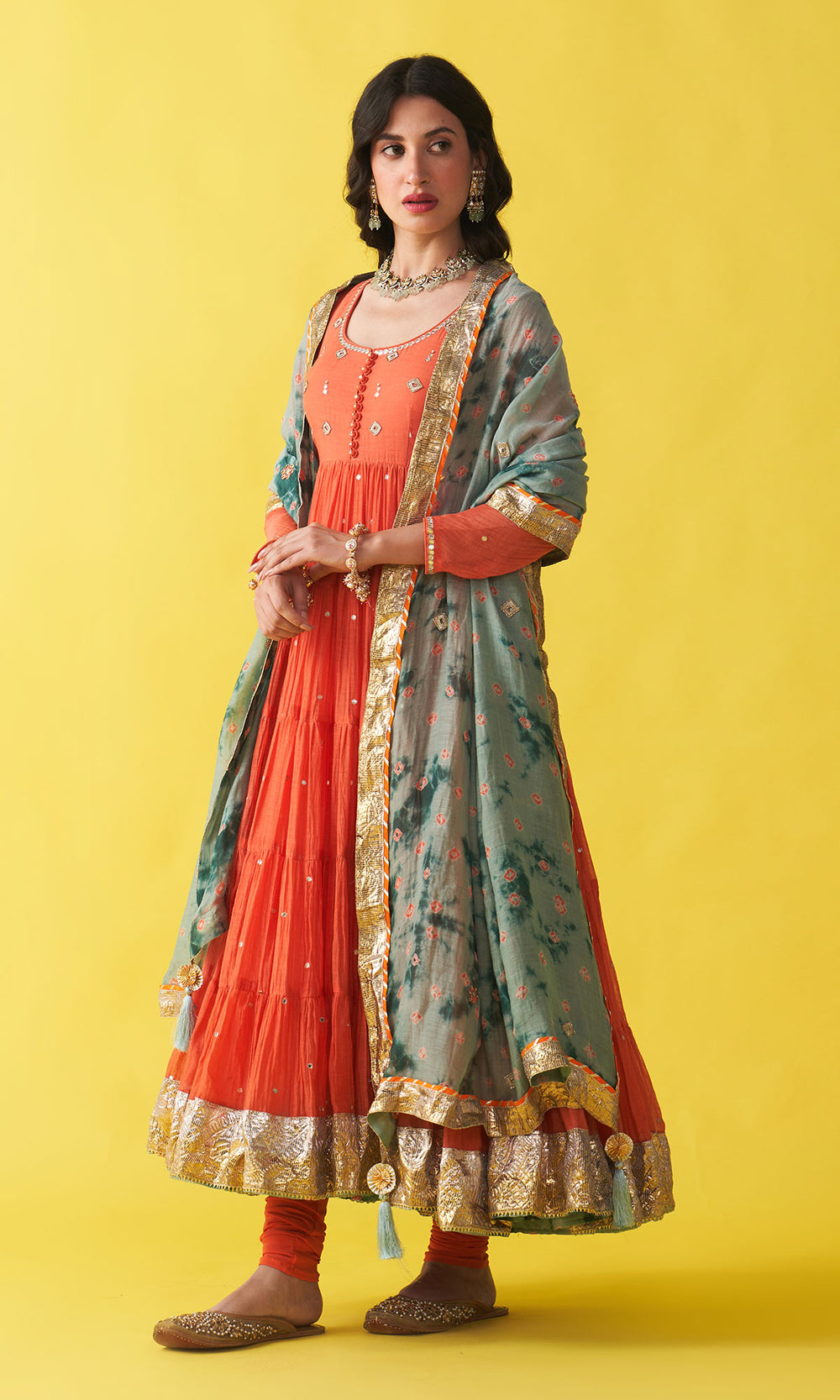 Gulzaar Orange Tiered anarkali with chooridar and bandhej dupatta (set of 3)