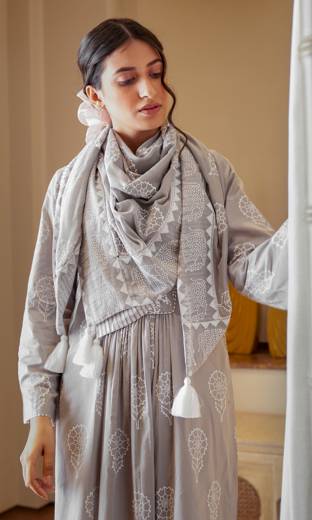 It has Flared Sleeves and pockets on both sides. This is with hand block printed scarf with tassels.