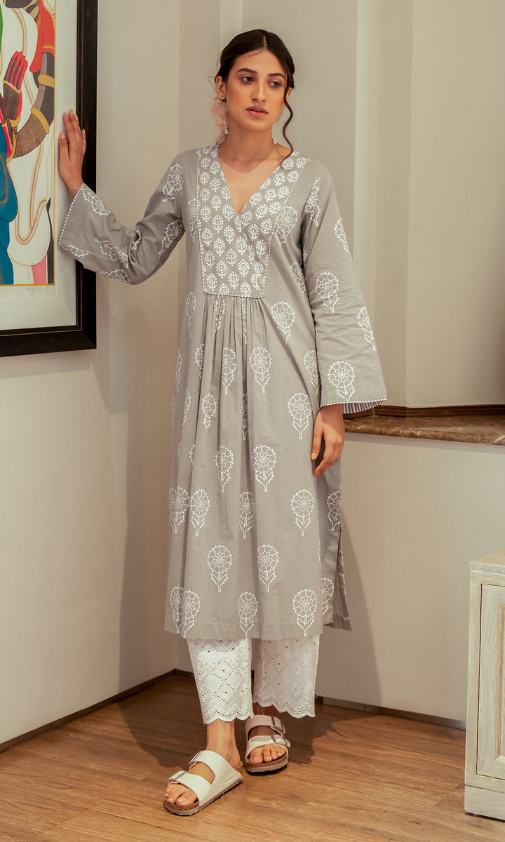 DAISY 2 GREY FLORAL PRINTED KURTA WITH PALAZZO - SET OF 2