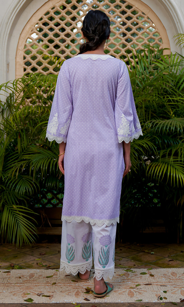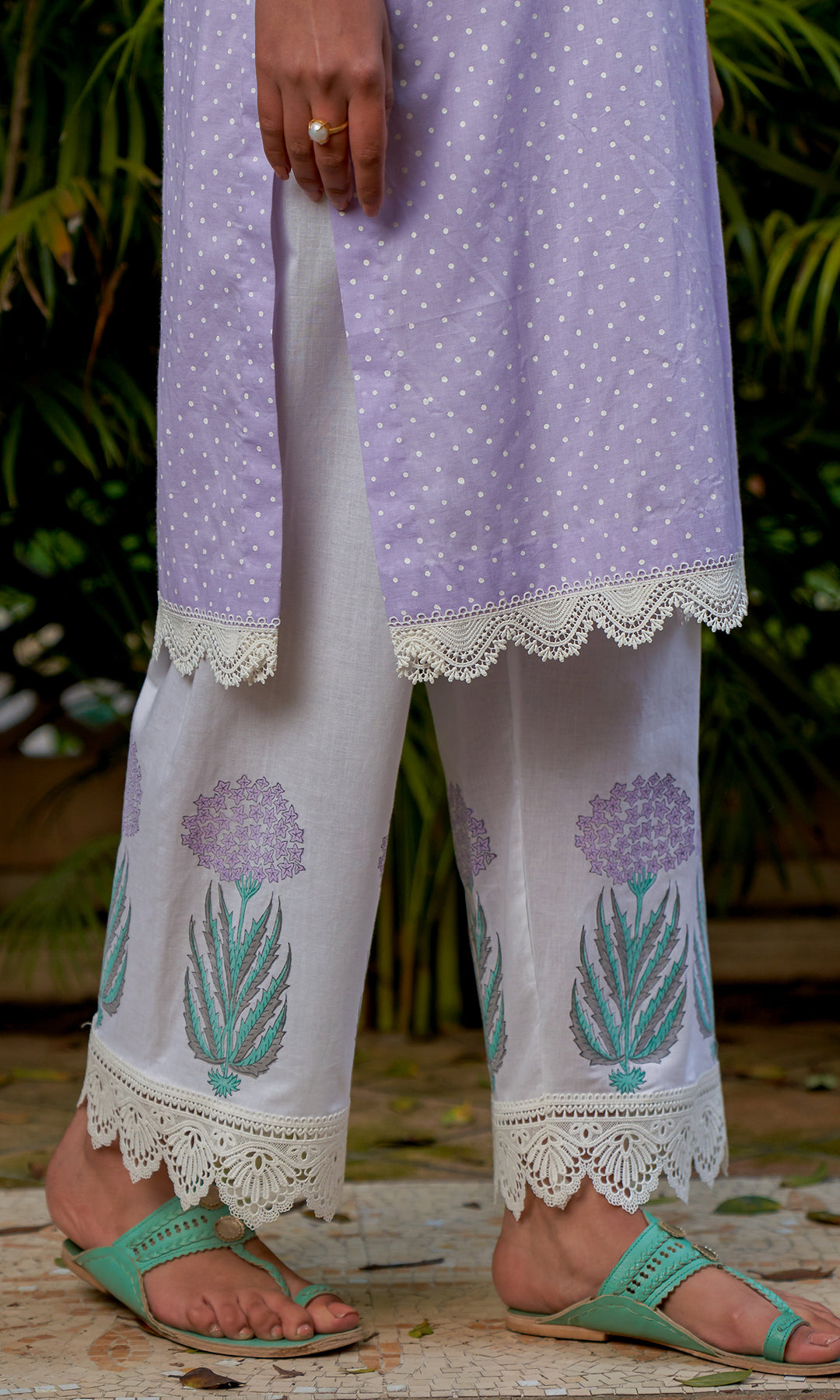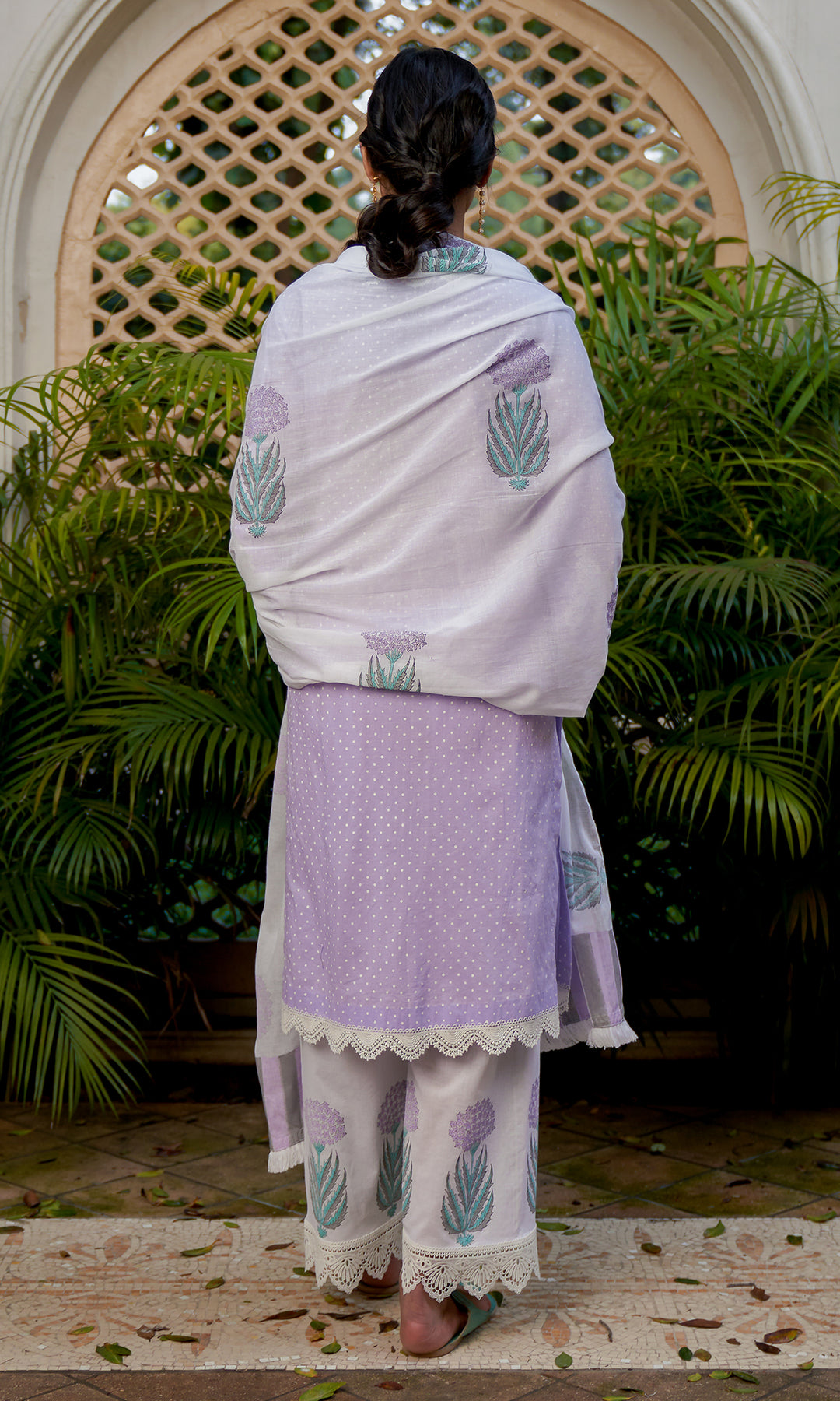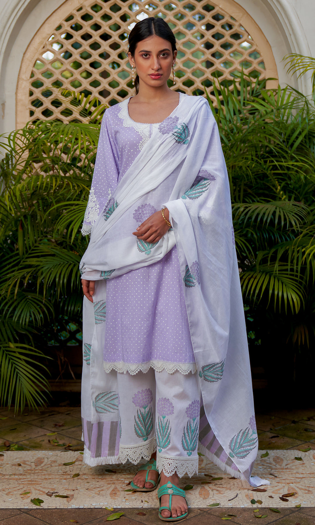 This set includes block-printed kurta, palazzo, and dupatta.