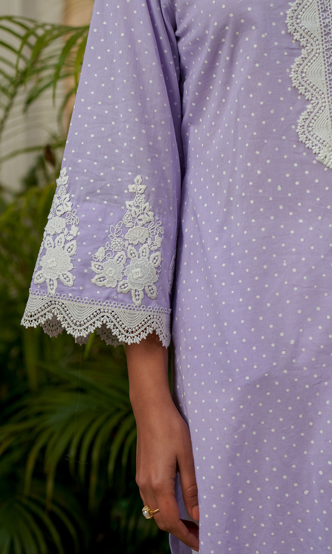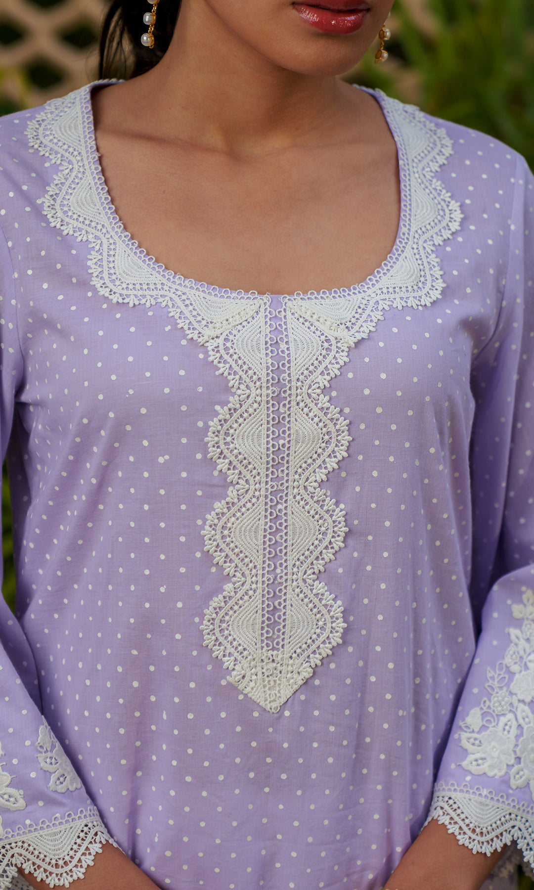 Kurta has a round neckline with lace detailing. Patchwork embroidery on sleeves. It is with a straight palazzo. Dupatta - finished with lace.