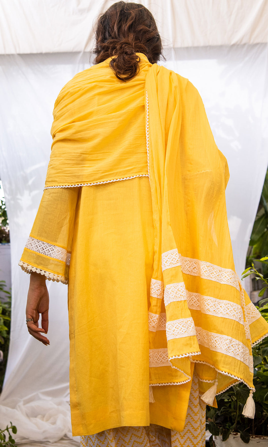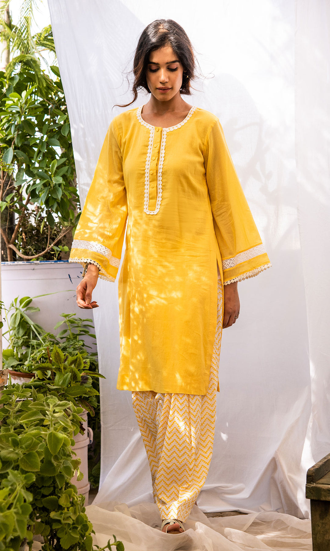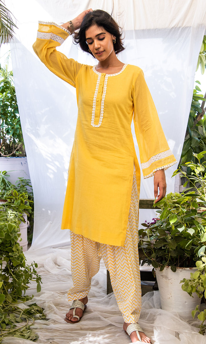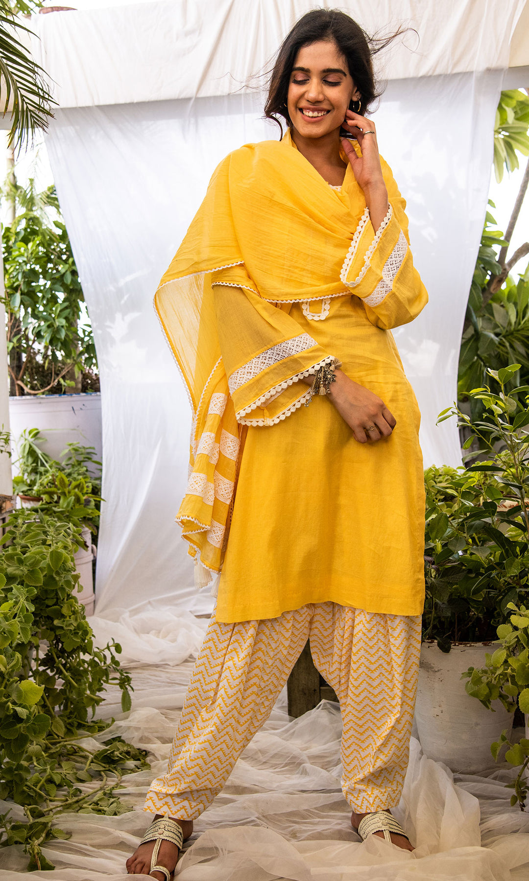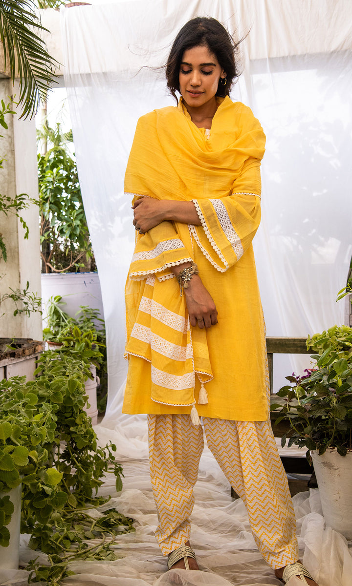 This three piece set includes kurta, salwar and dupatta Solid Kurta with flared sleeve with lace detailing. Chevron printed salwar, Mulmul dupatta with lace detailing.
