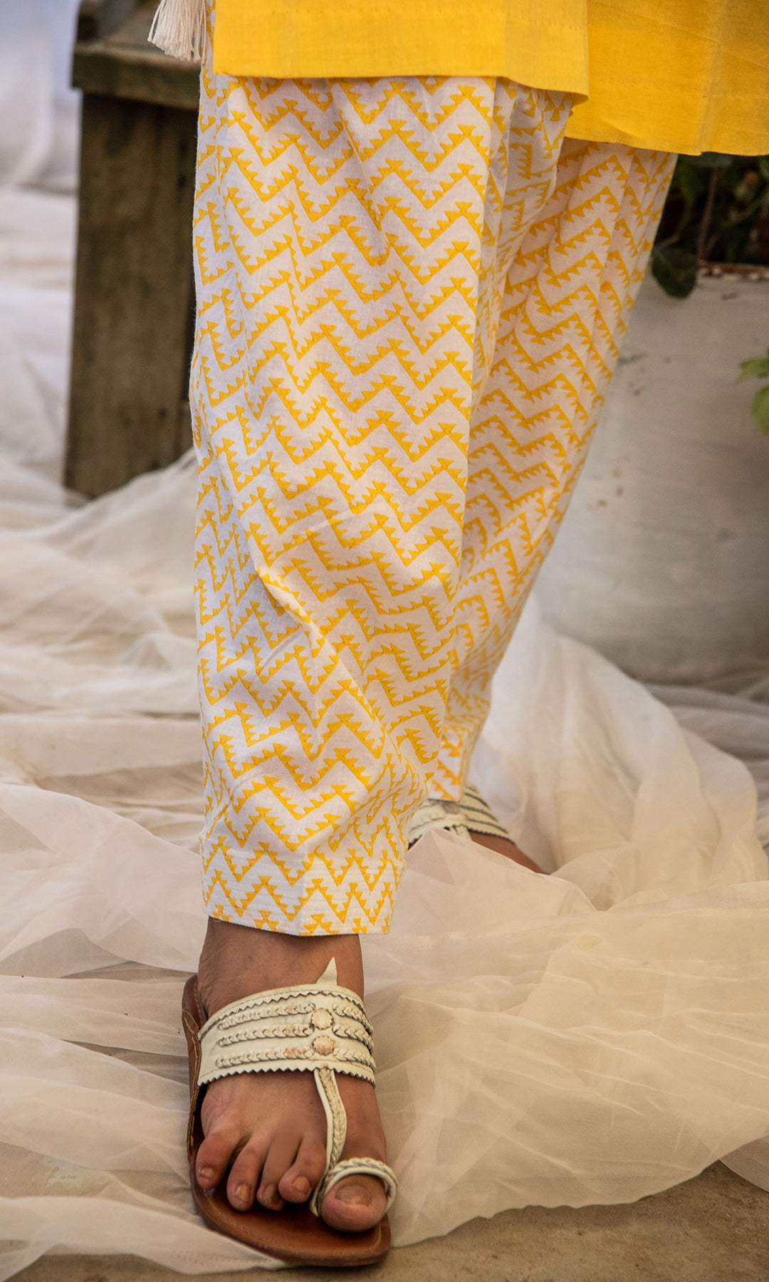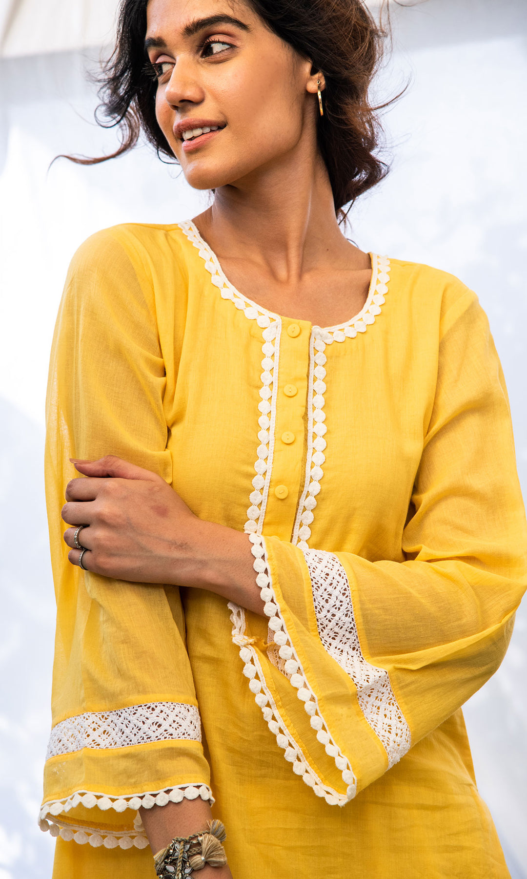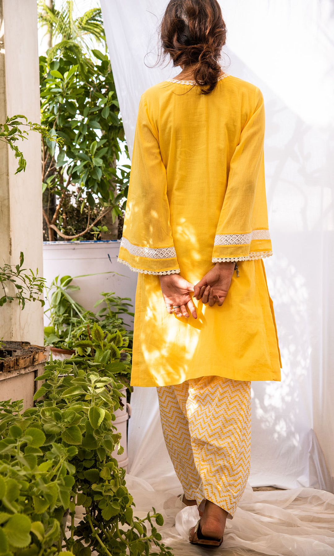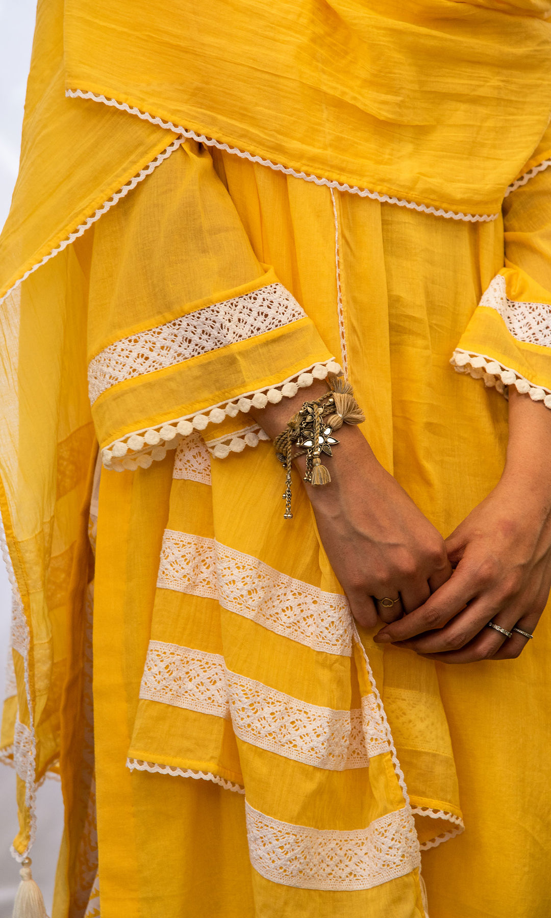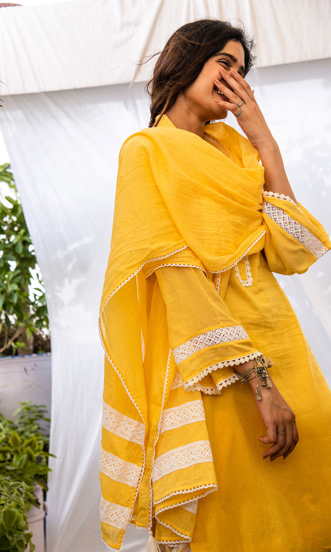 This three piece set includes kurta, salwar and dupatta Solid Kurta with flared sleeve with lace detailing. Chevron printed salwar, Mulmul dupatta with lace detailing.