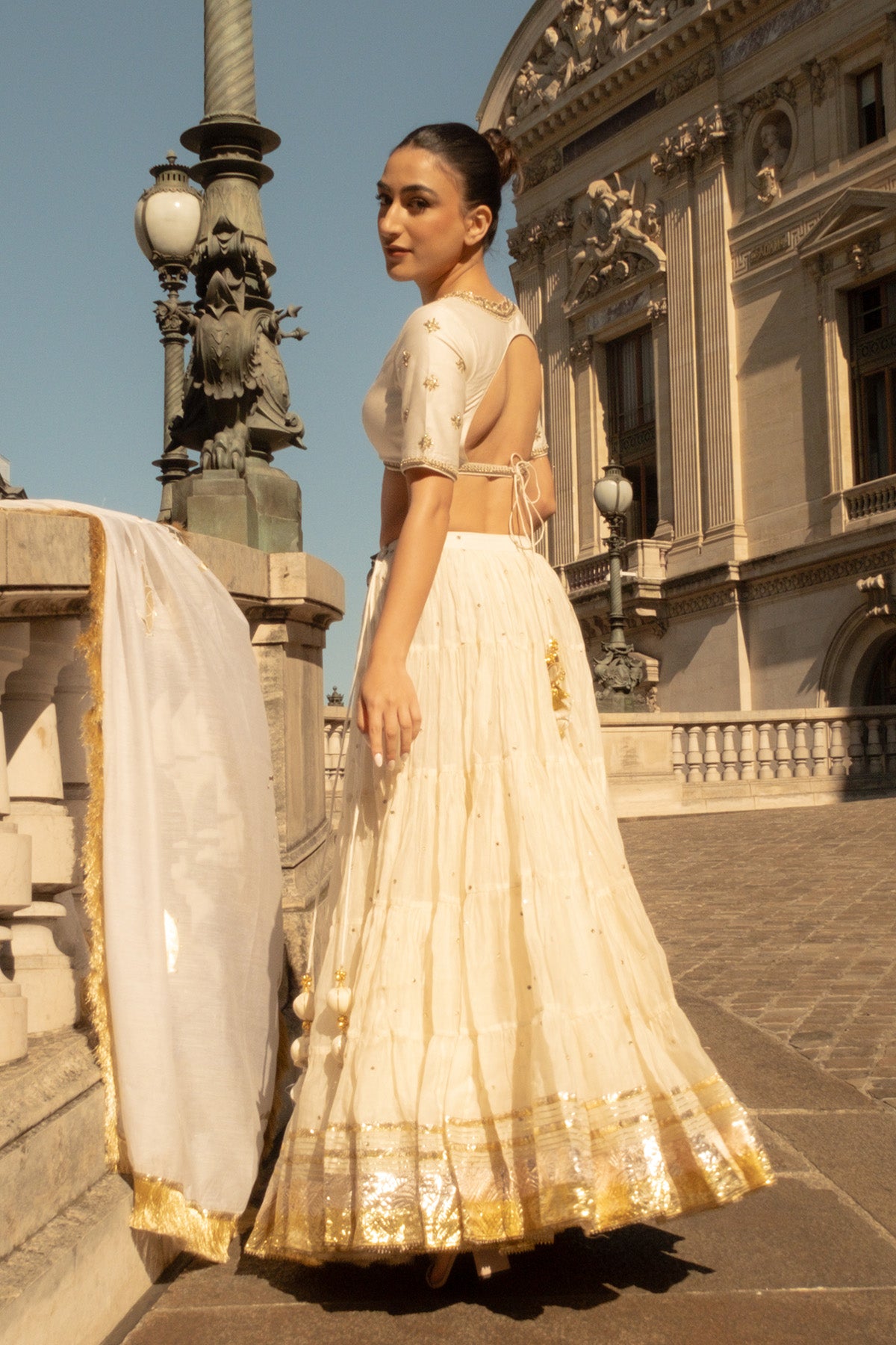 Pakeezah ivory Tiered  lehenga with  embroidered blouse  and ivory  dupatta (set of 3)