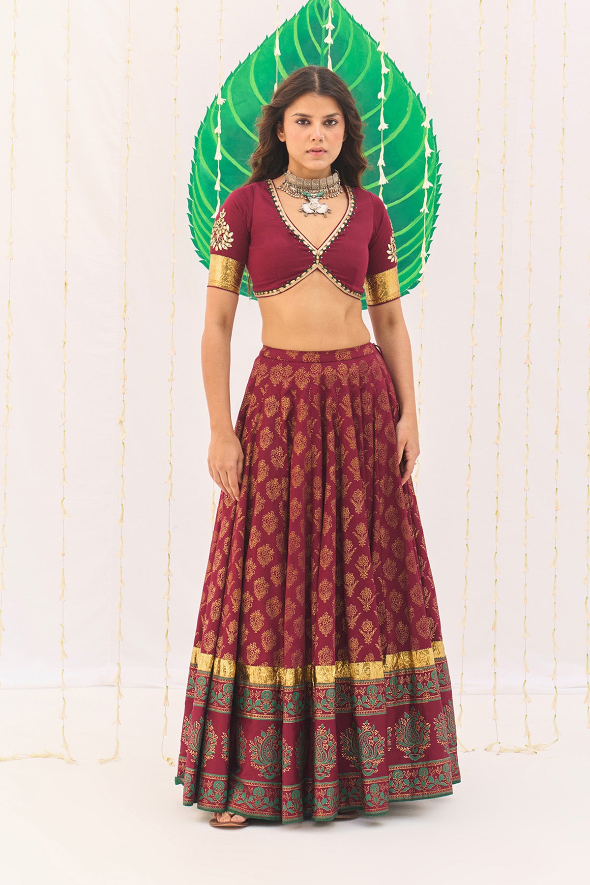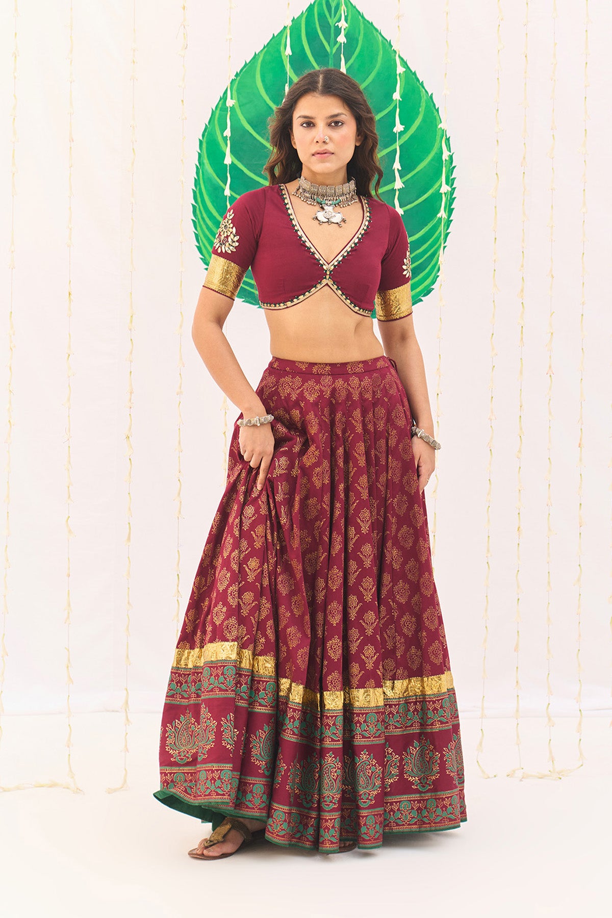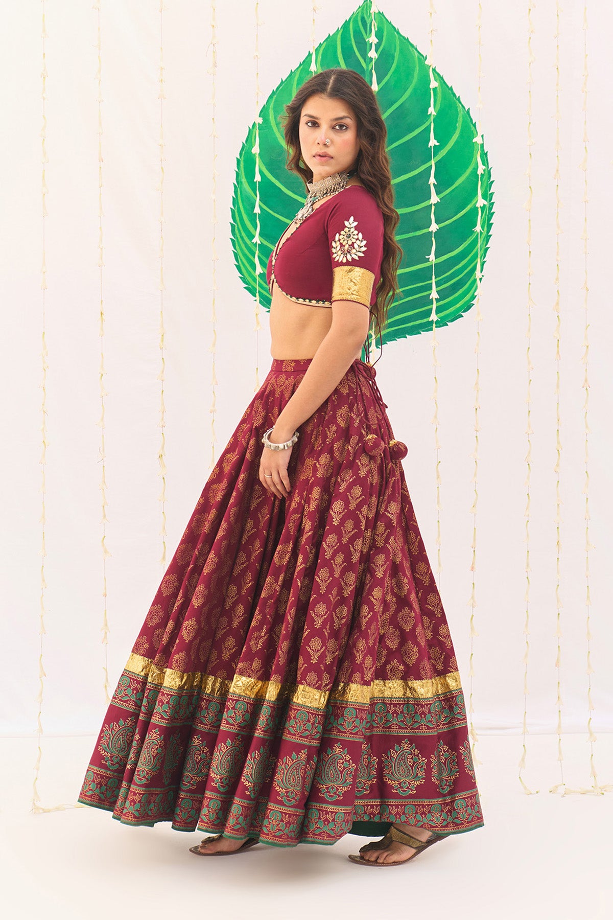 Jameela Block Printed Berry Red Lehenga with Embroidered Blouse and Dupatta ( Set of 3)