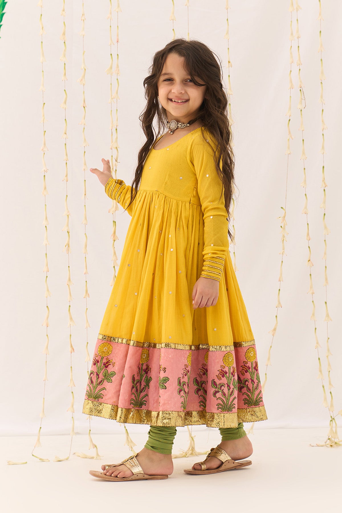 This anarkali features a beautifully flared block printed ghera enhanced with delicate gota detailing it comes with chooridar. the dupatta carries a stiking leheriya inspired block