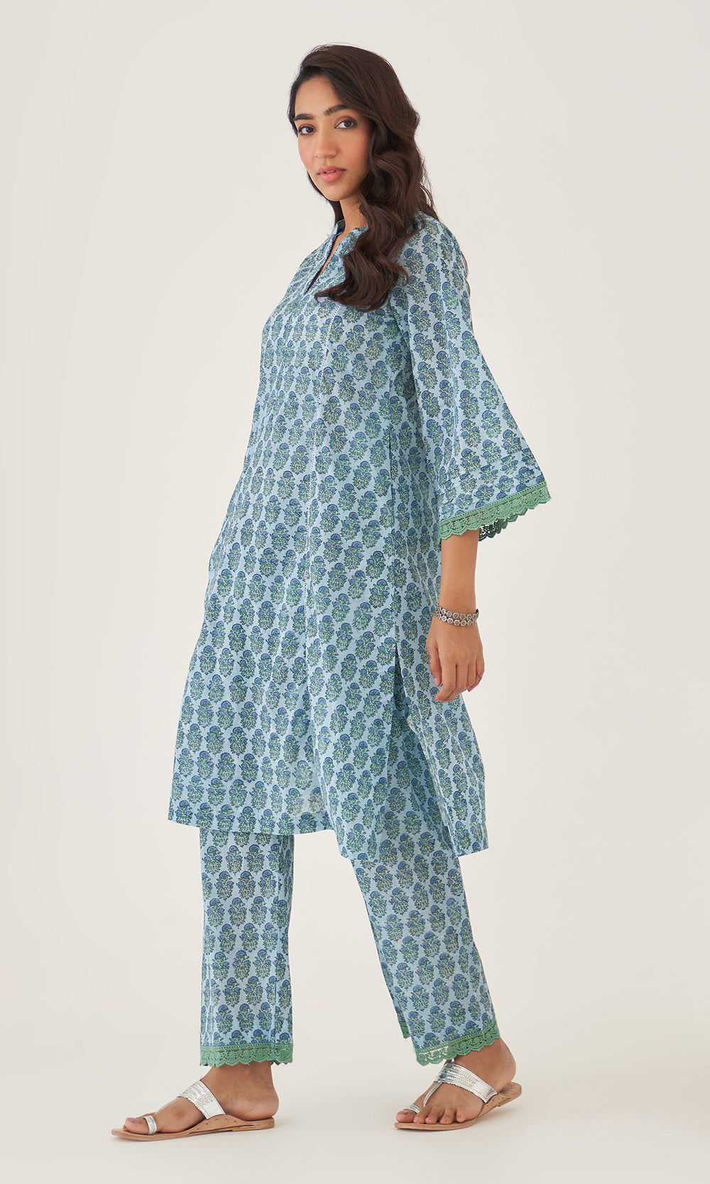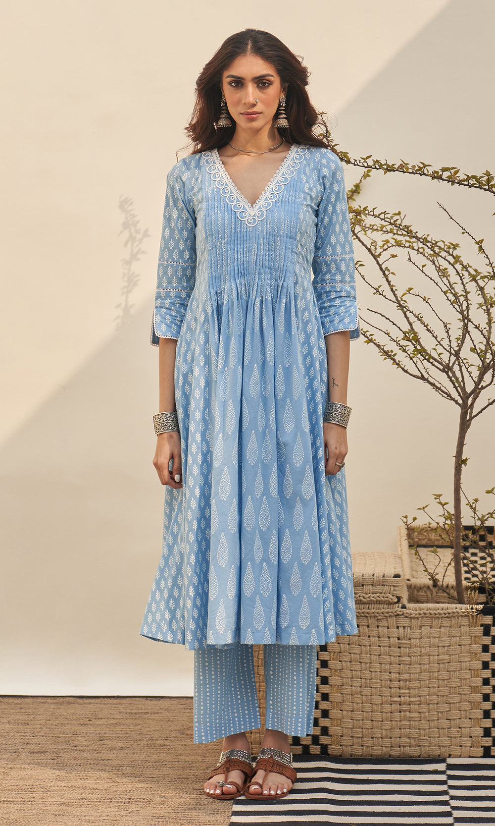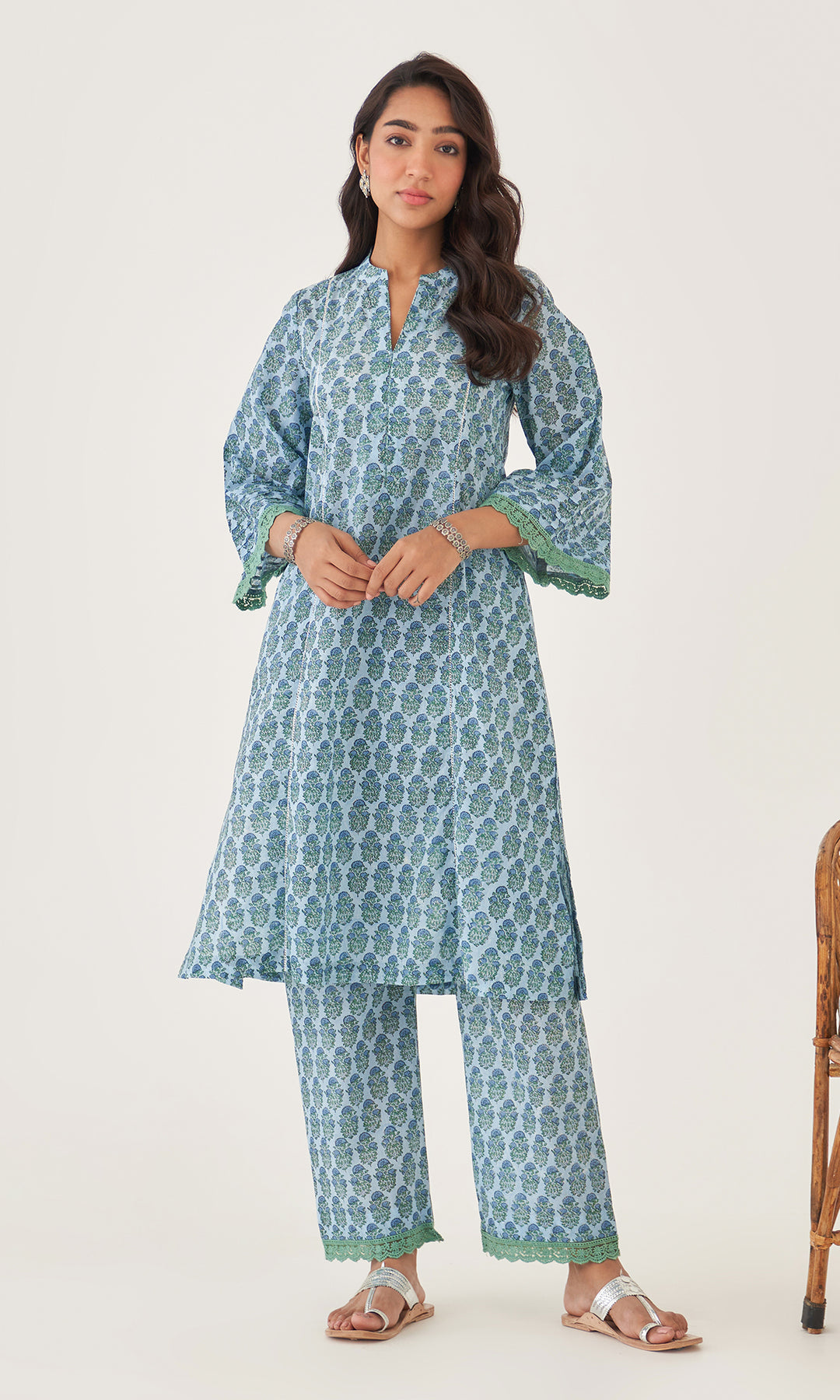 Daisy Vol 3 - Powder Blue Hand Block Printed Straight Kurta Set of 2