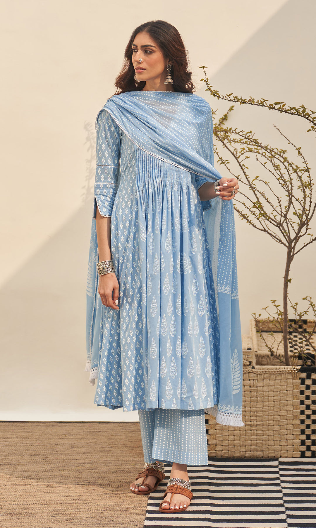 Kapaas Vol. 2 Powder Blue Block Printed Gathered Kurta With Palazzo And Block Printed Dupatta - Set of 3