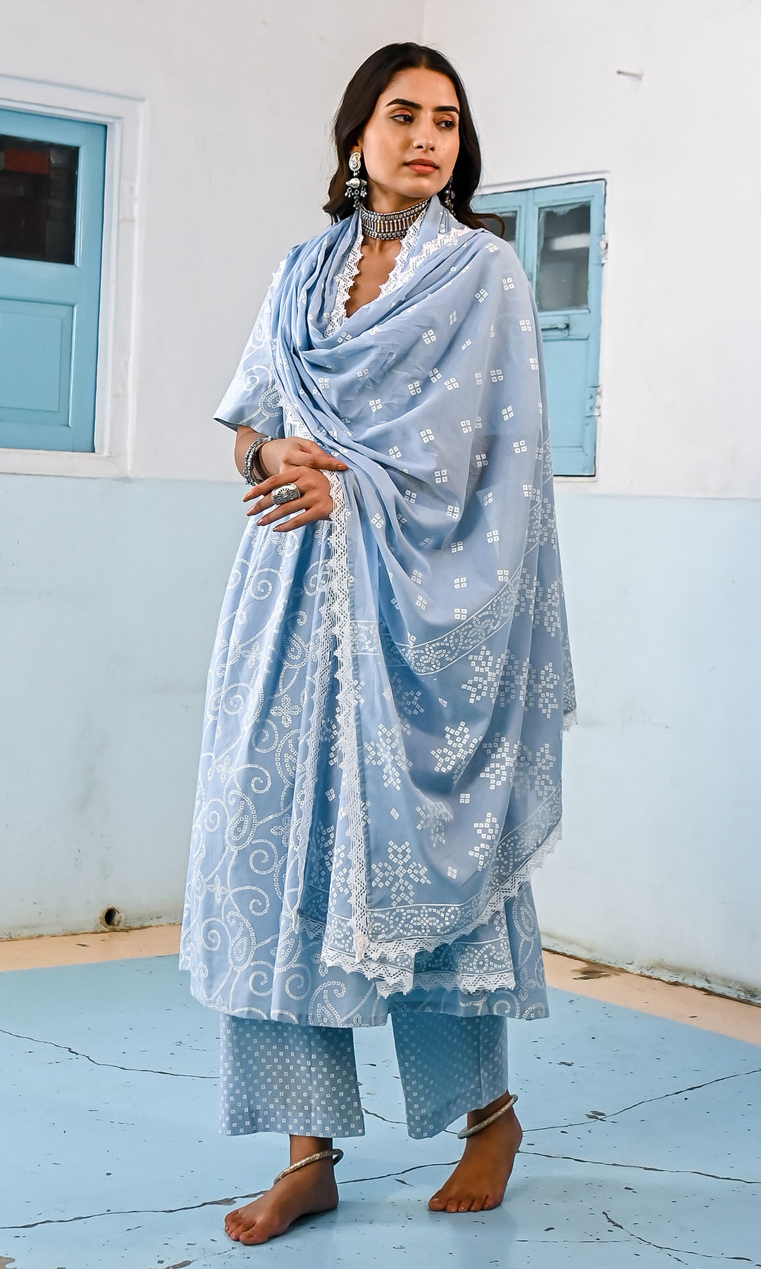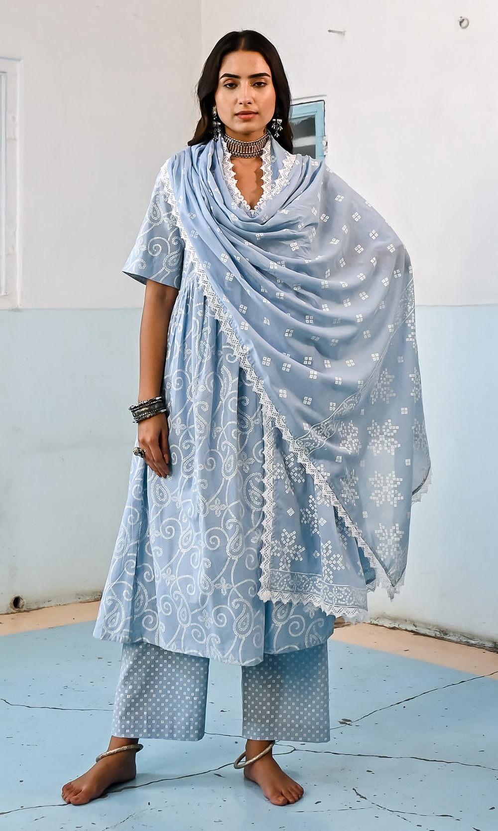 Kapaas Vol. 2 Powder Blue Block Printed Gathered Kurta with Palazzo and Leheriya Dupatta - Set of 3