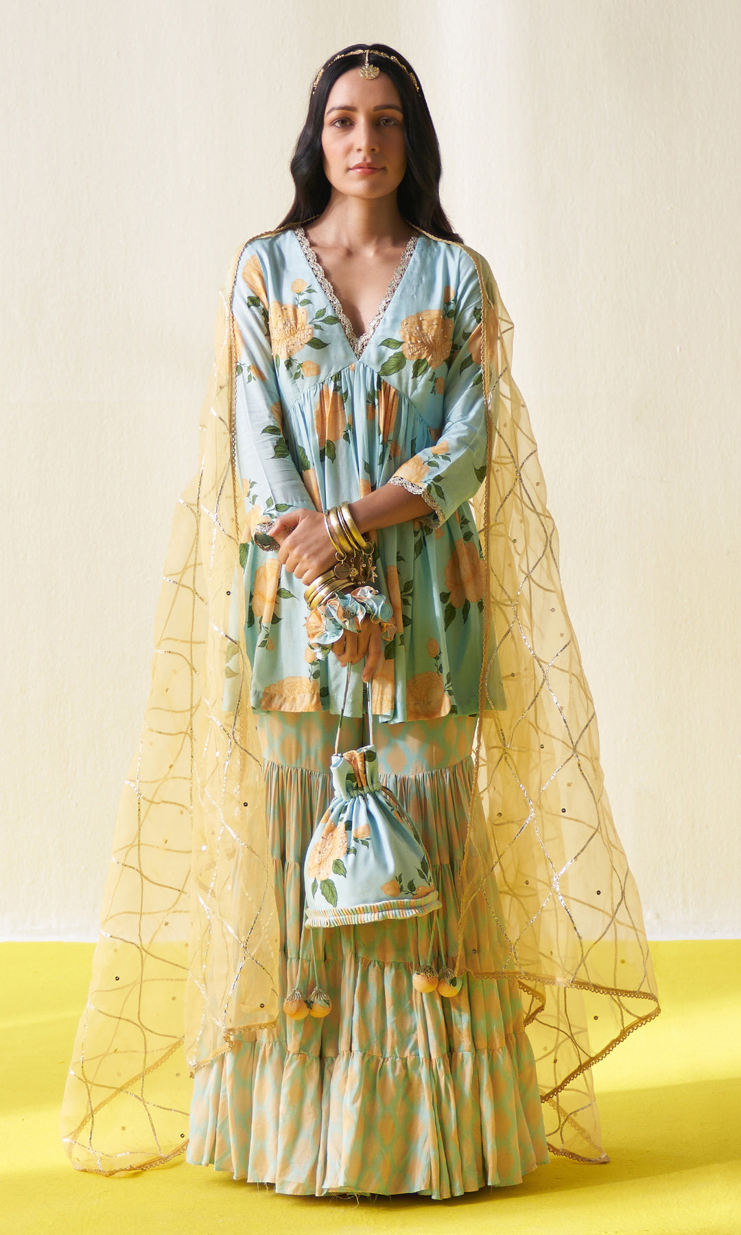 This set includes kurta, sharara and dupatta. Kurta yoke is embellished with sequins annd pearl embroidery. Neckline has lace detailing. It comes with printed sharara and gota embroidered dupatta.