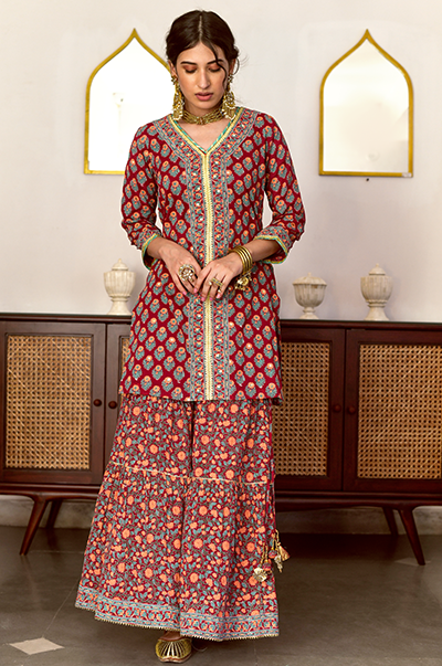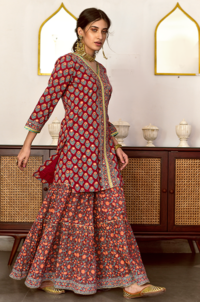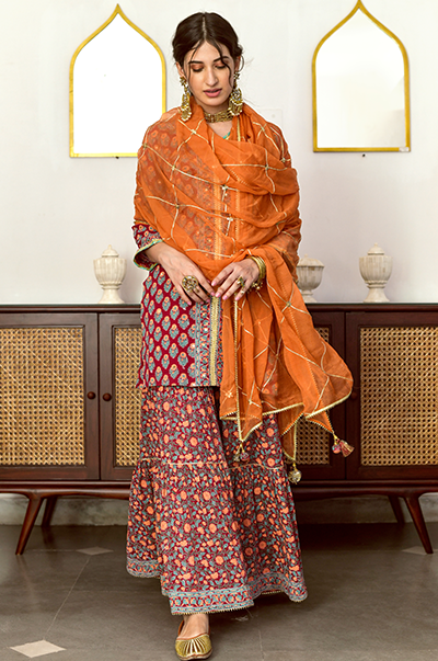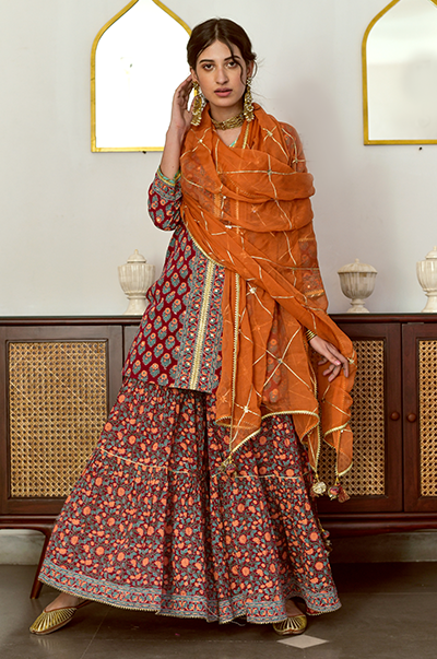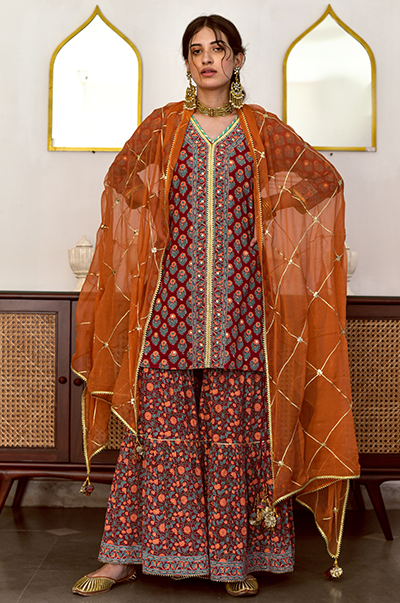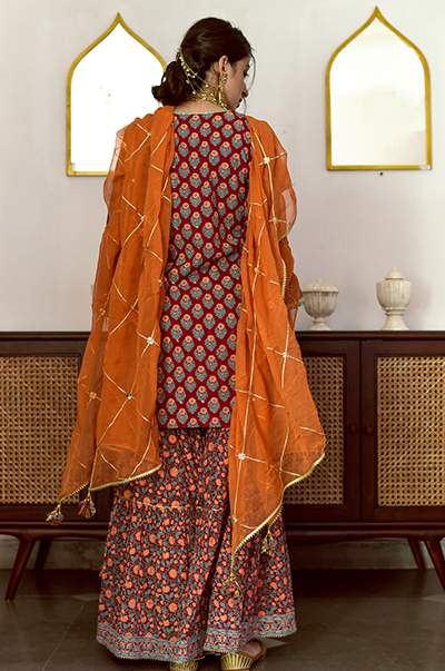 Redblock printed short kurta with sequins embroidery and gota detailing. Hand block printed sharara with gota edgings. Orange Rust chiffon dupatta with hand block print and tassel detailing.