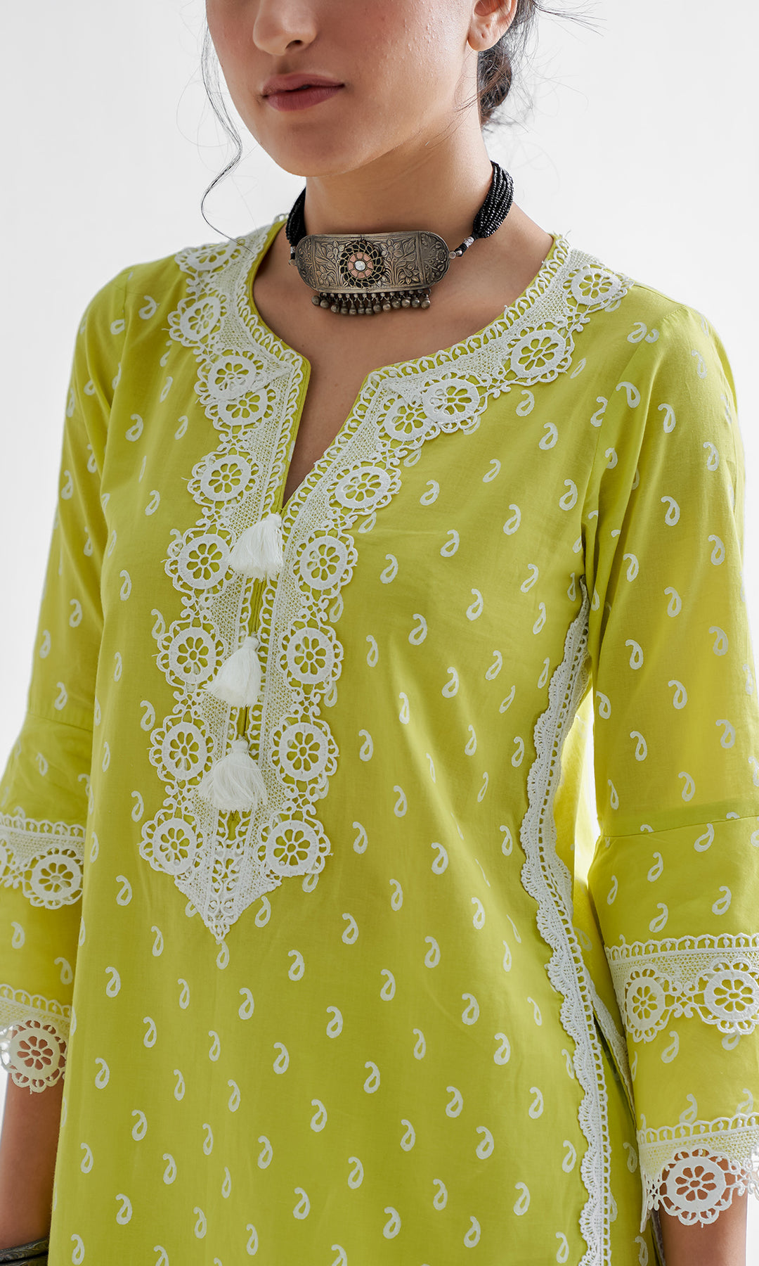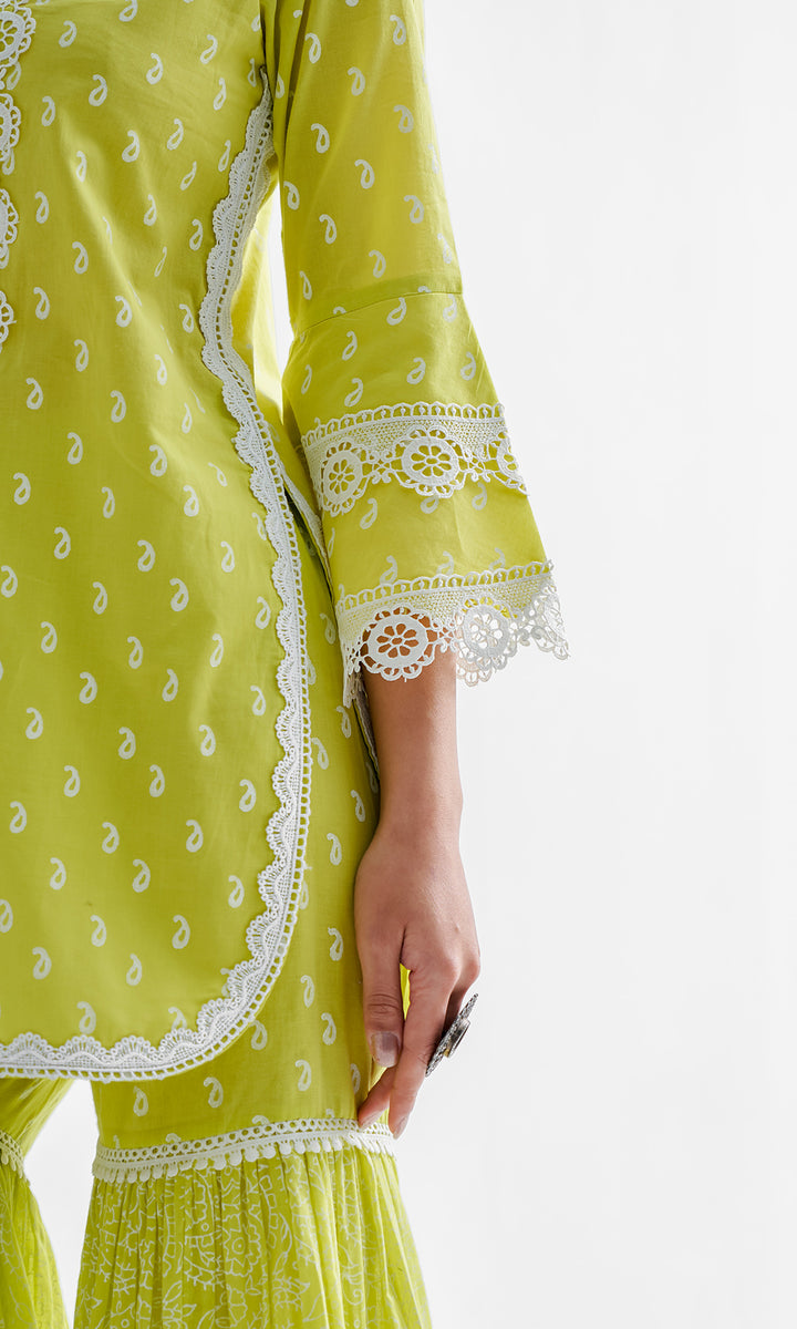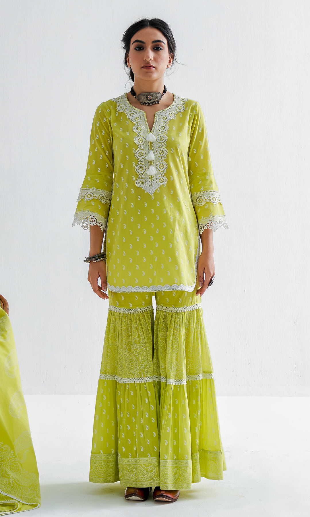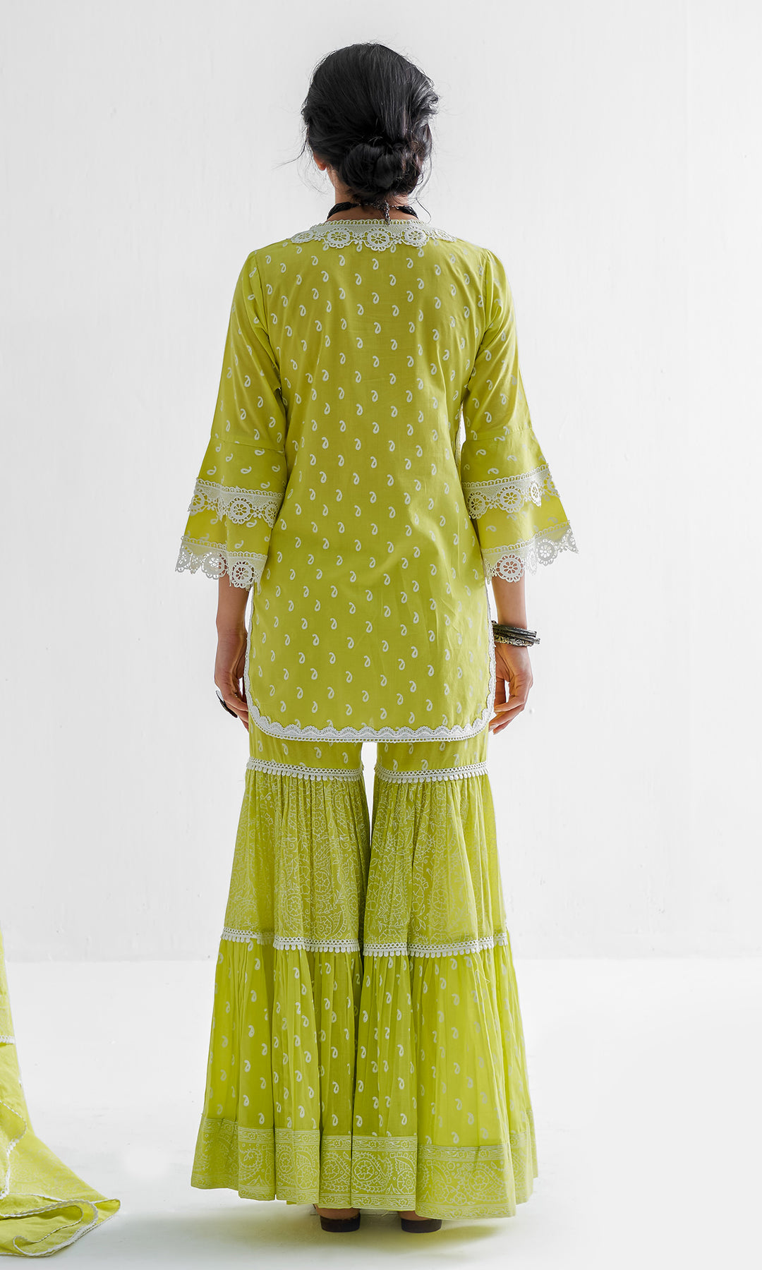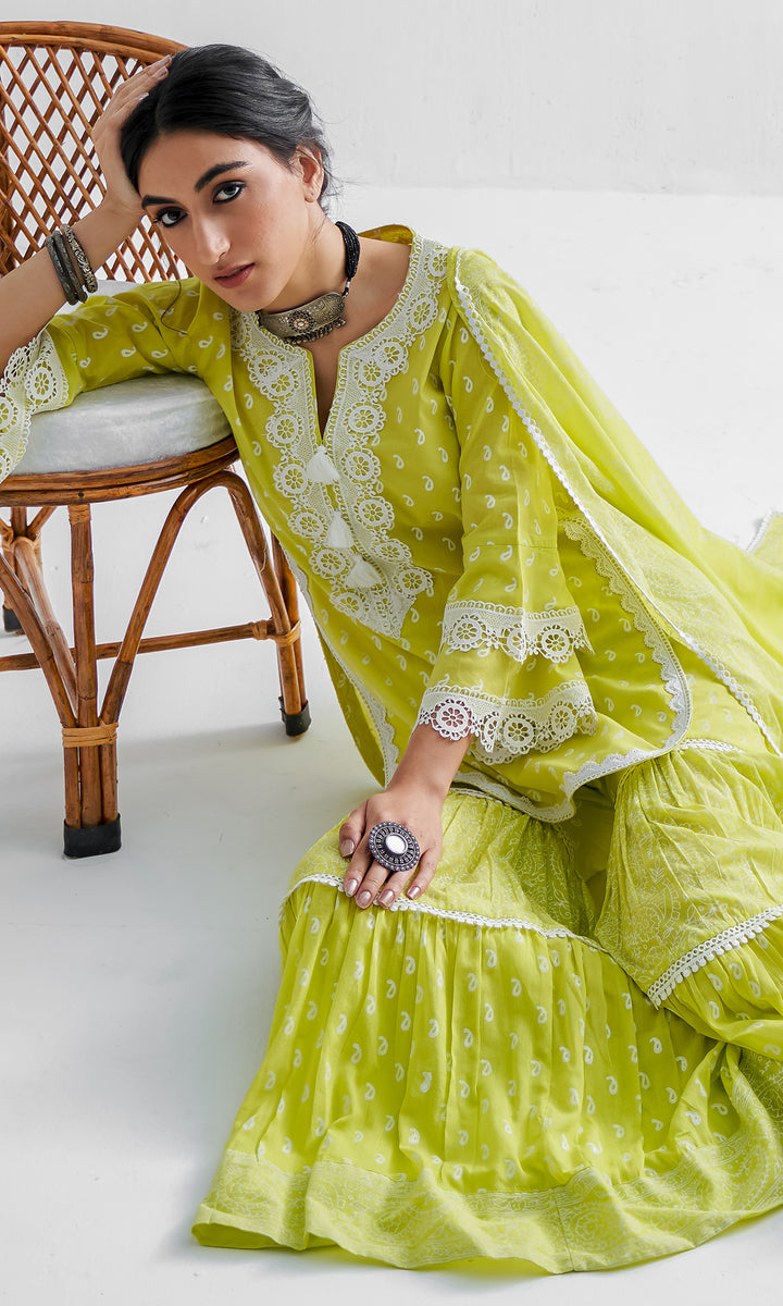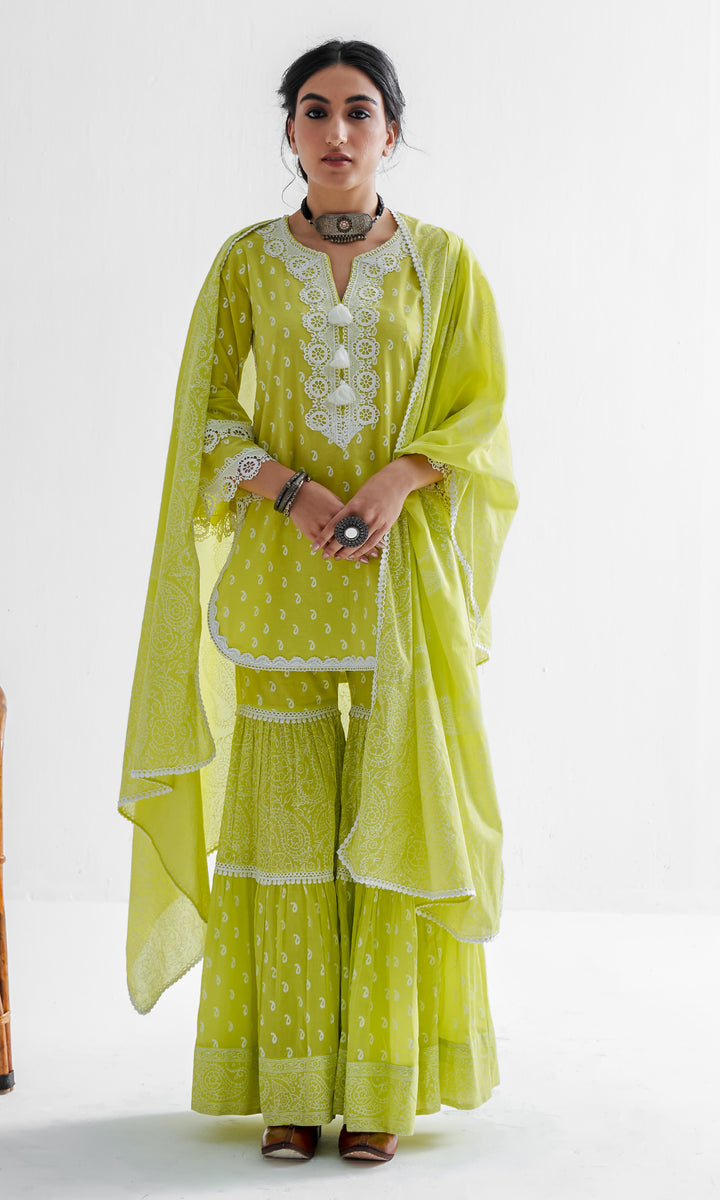 Firdaus Khari Lime Green Block Printed Garara - Set of 3