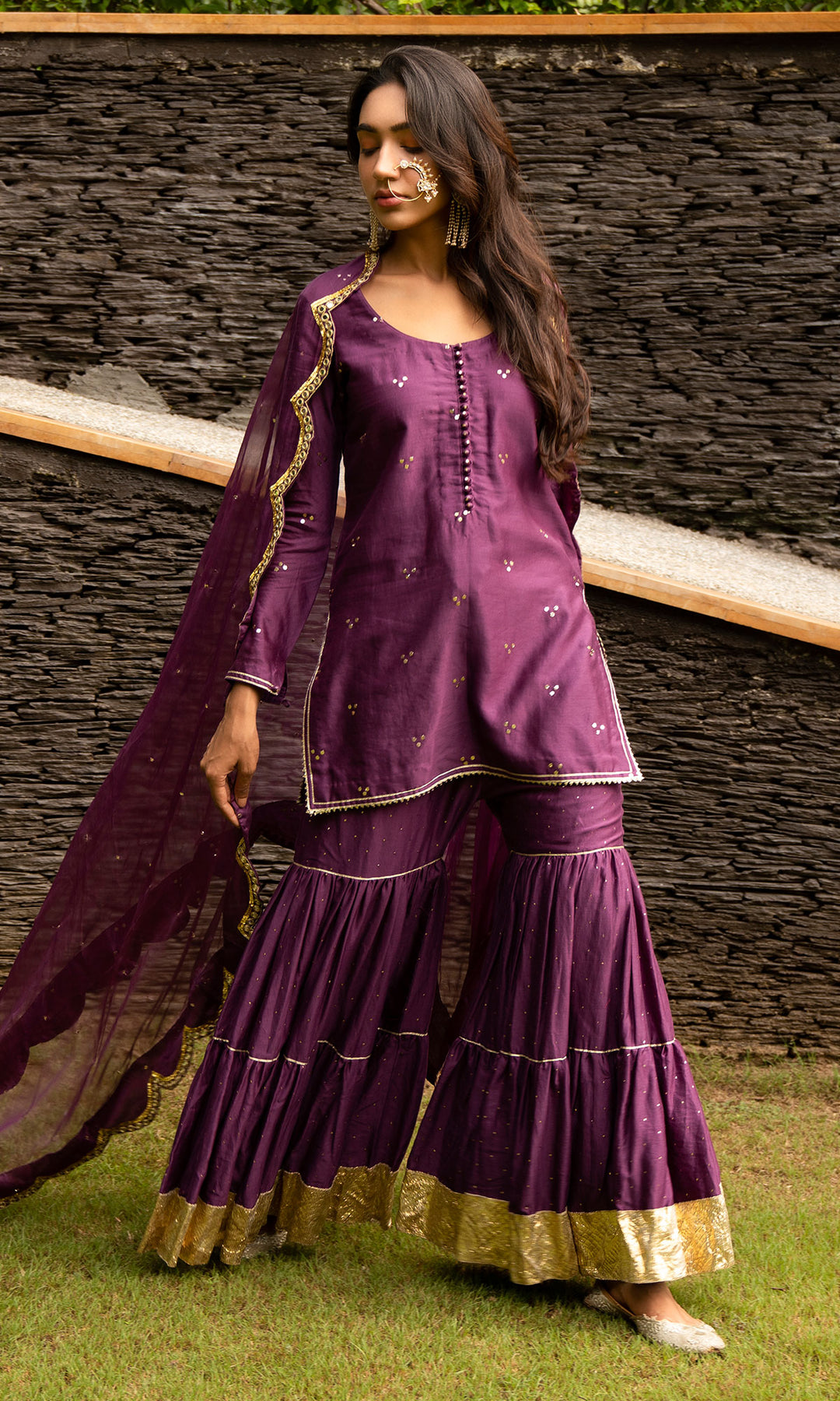 Purple Mukaish Chanderi Kurta with Luppi button detailings and gota finishing. Mukaish Chanderi Gharara with broad Hyderabadi Gota detailing. Purple organza Dupatta with intricate mukaish and mirror hand embroidery finishing.