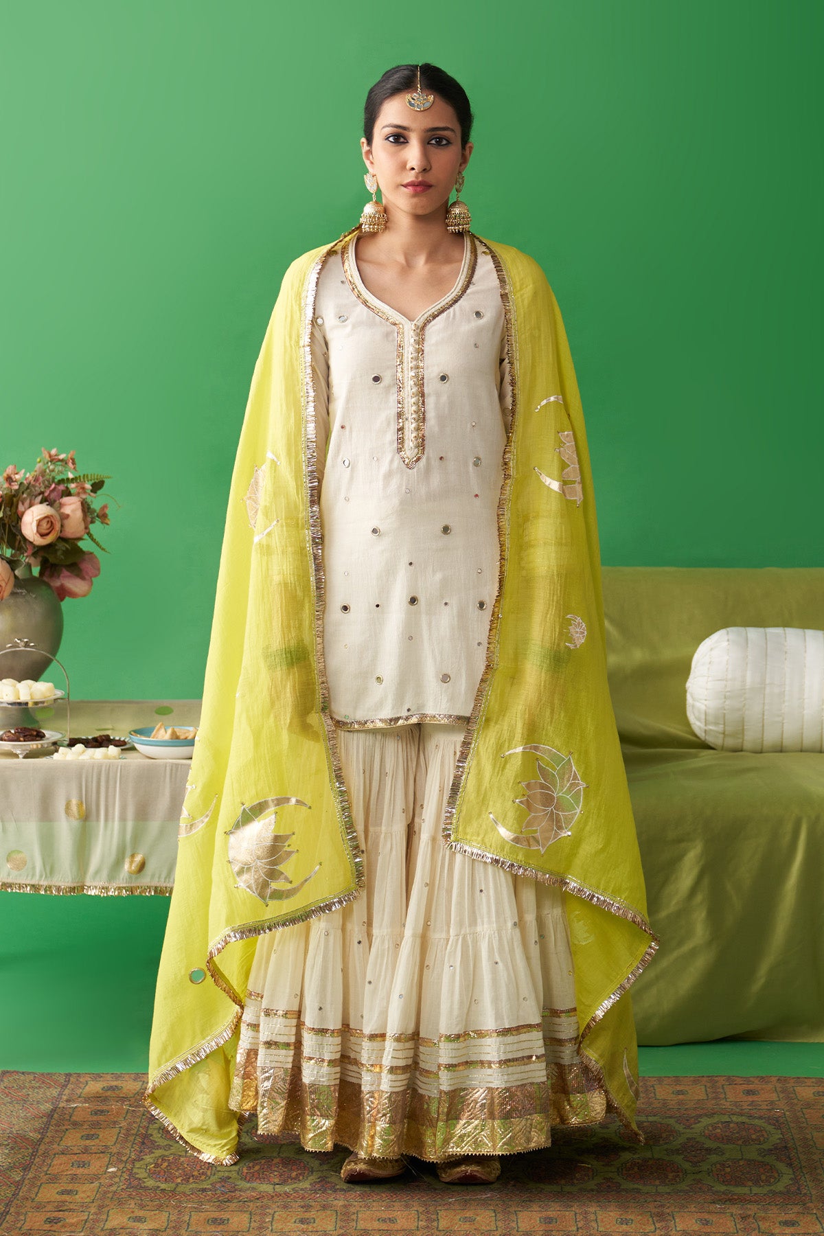 Jhoom Ivory short kurta with garara and neon green foil printed chand dupatta (set of 3)