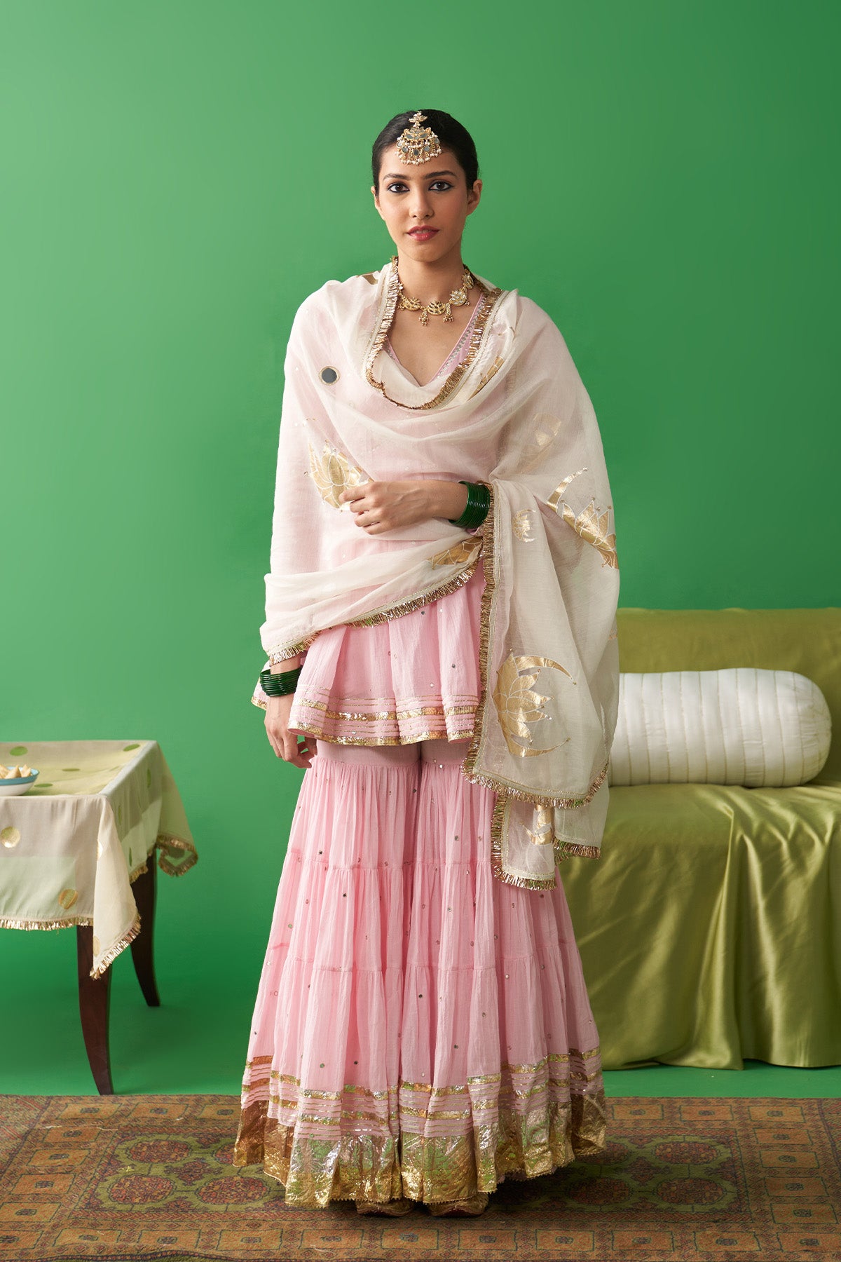 This set includes short anarkali with tiered garara and dupatta. Kurta and foil printed dupatta is detailed with hand embroidery and finish with gota lace. Garara is detailed