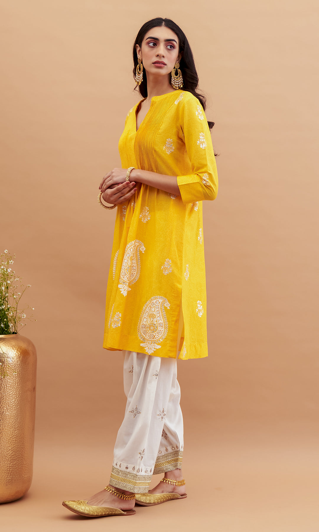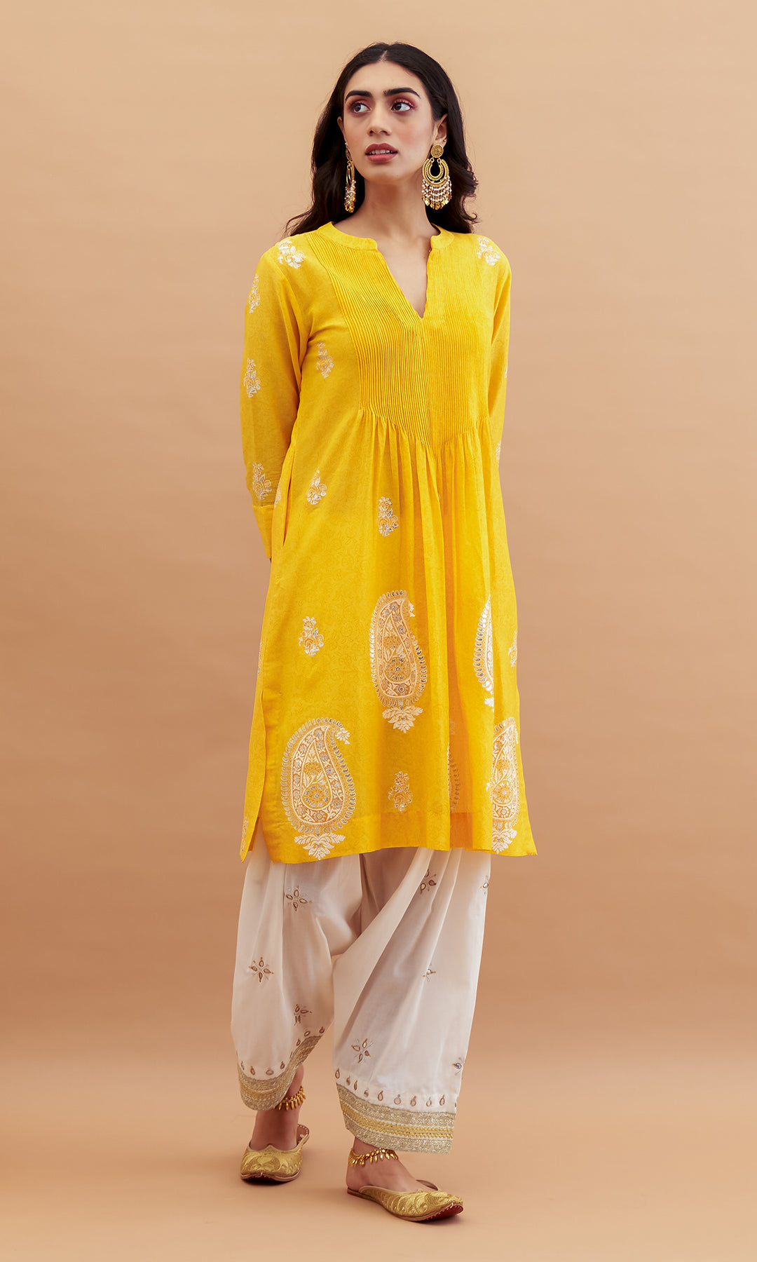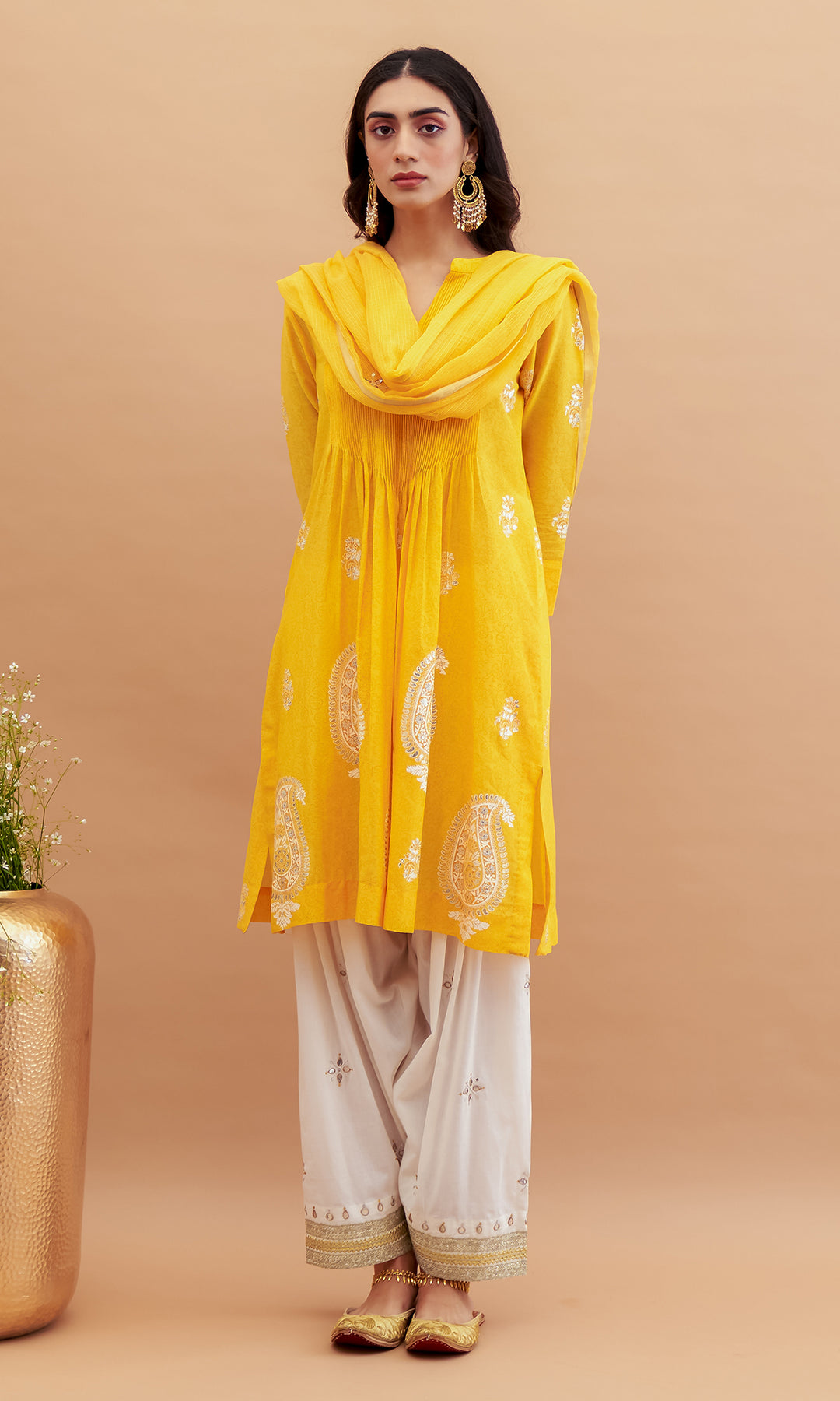 Rumi foils - Mustard Yellow block printed pintuck kurta with embroidered salwar and dupatta - set of 3