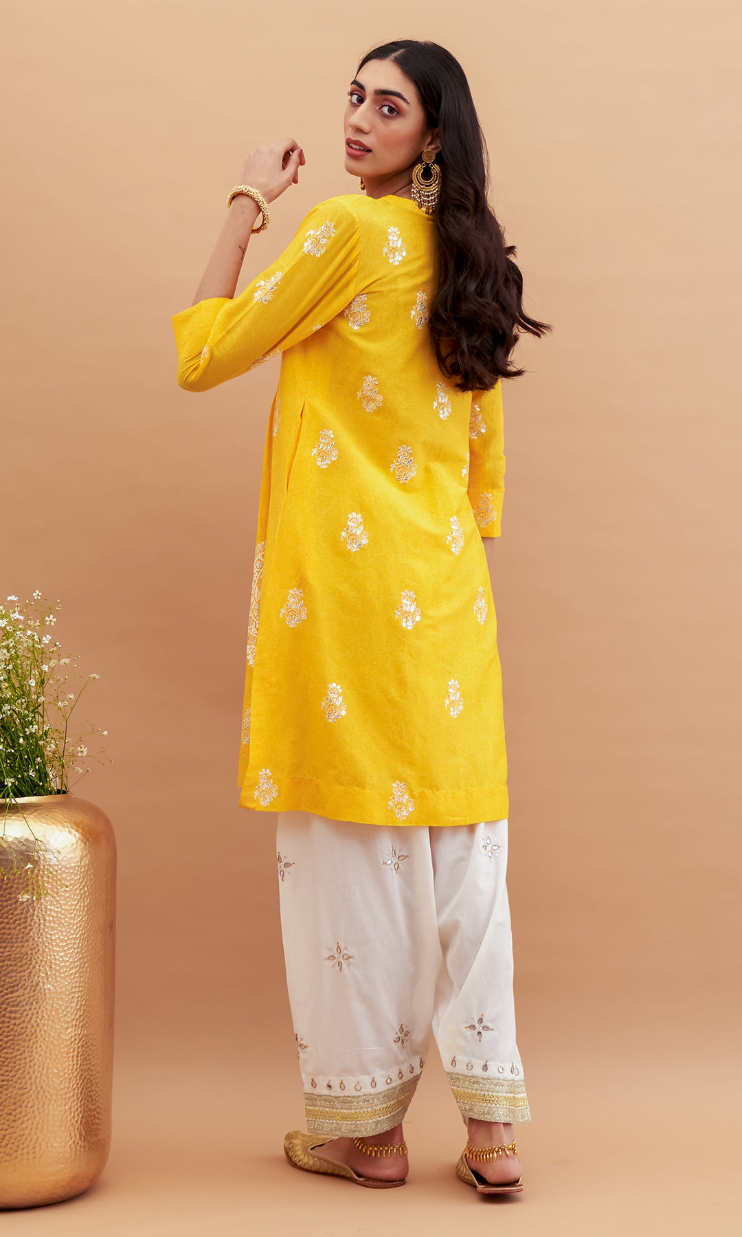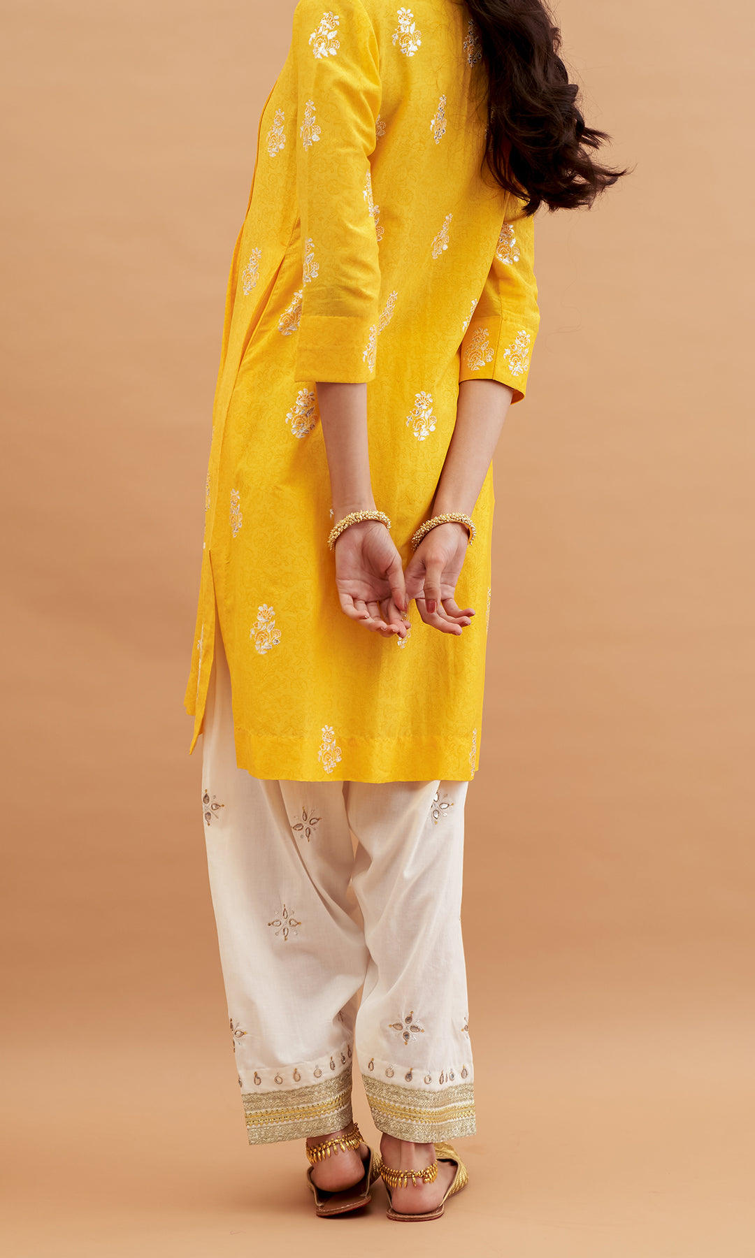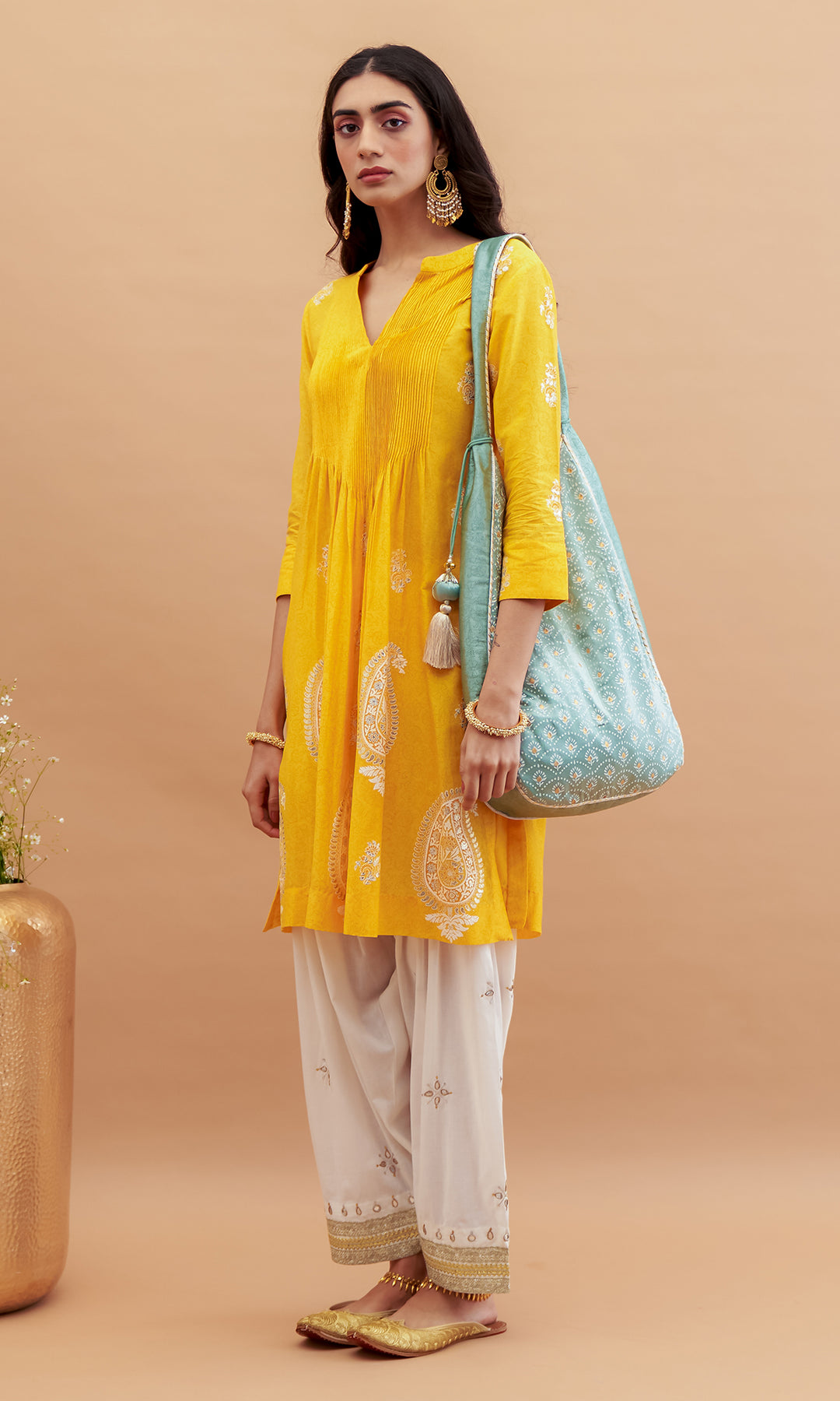 Rumi foils - Mustard Yellow block printed pintuck kurta with embroidered salwar and dupatta - set of 3