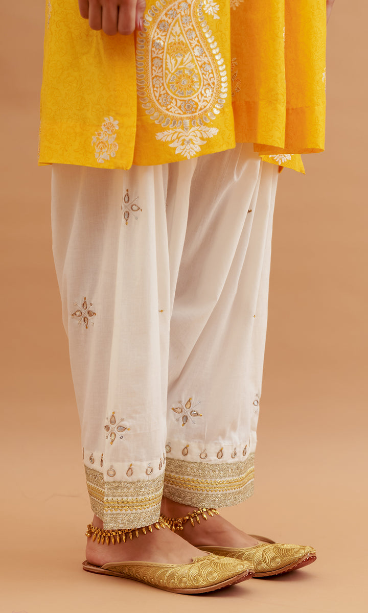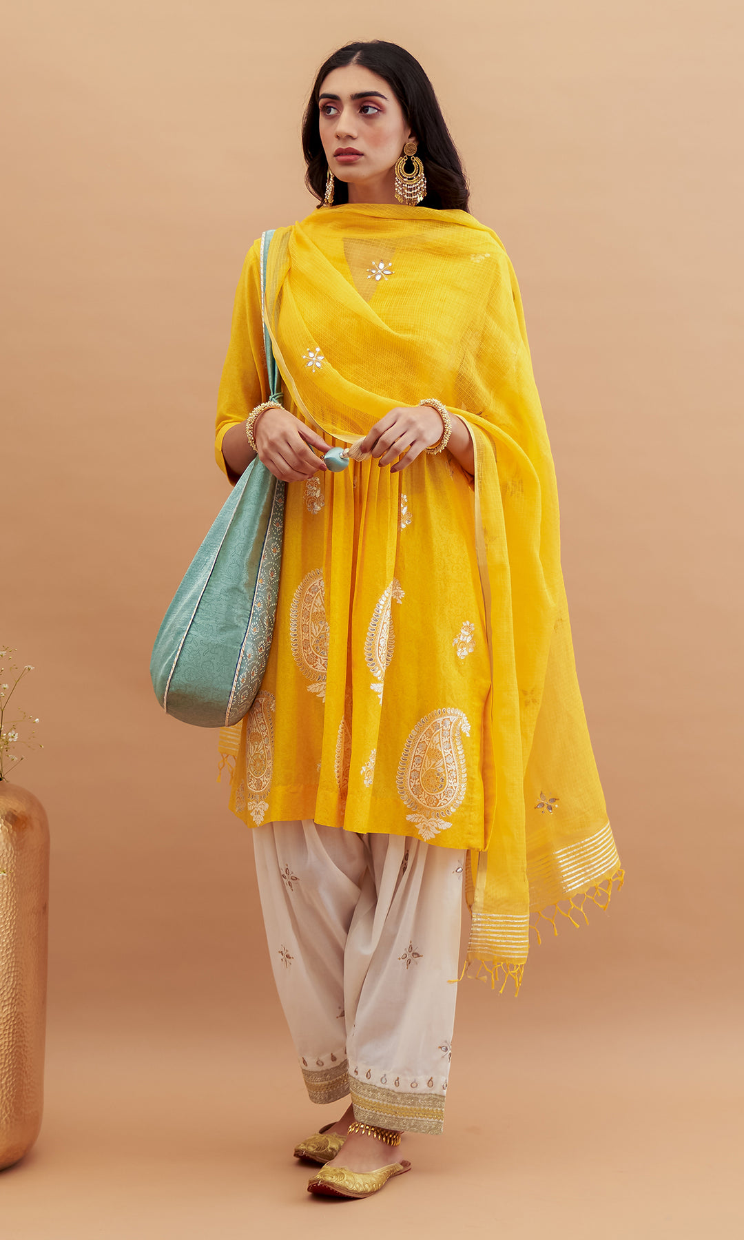 This set includes block and foil printed kurta, block printed dupatta and salwar .kurta has pintuck detailing. It has pockets on both sides. It comes with embroidered salwar. Dupatta has Gota Patti and dabka embroidery.