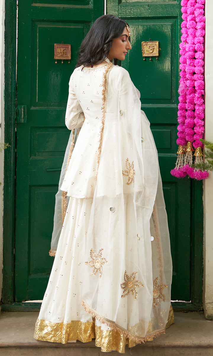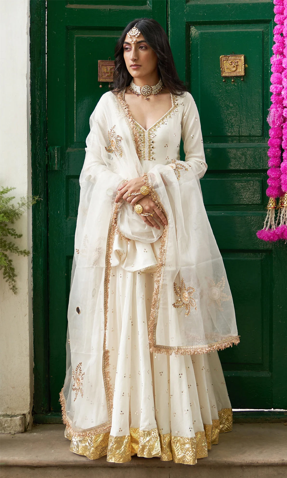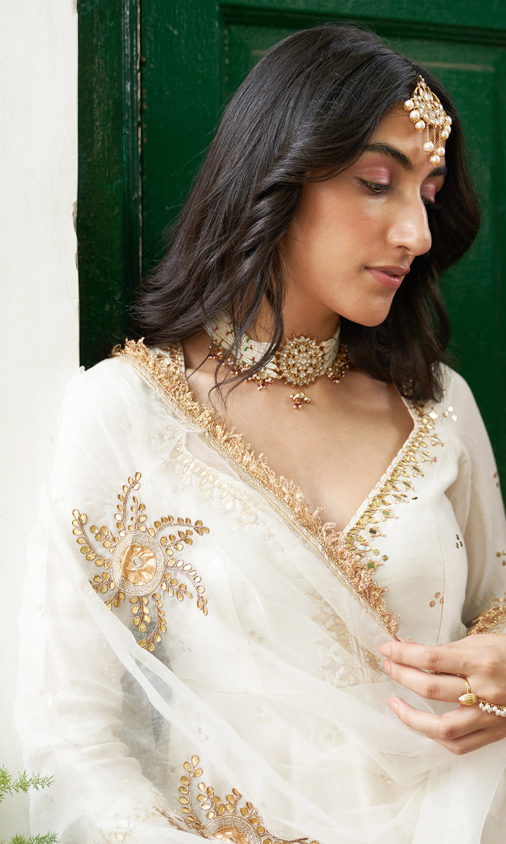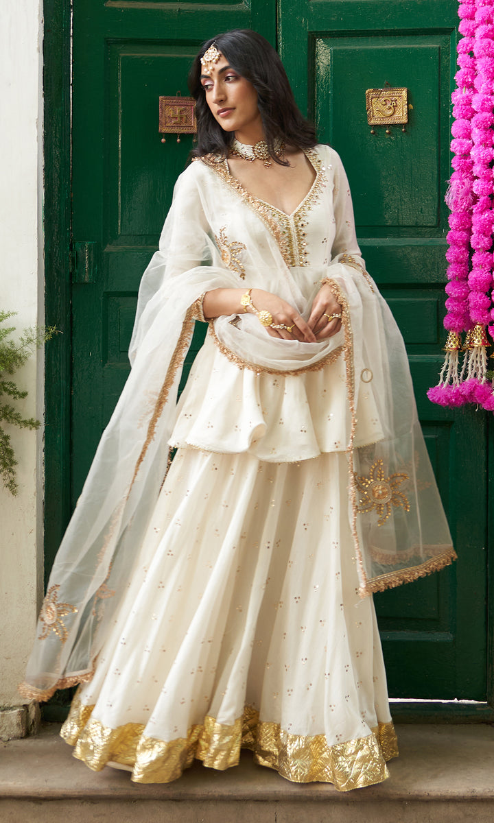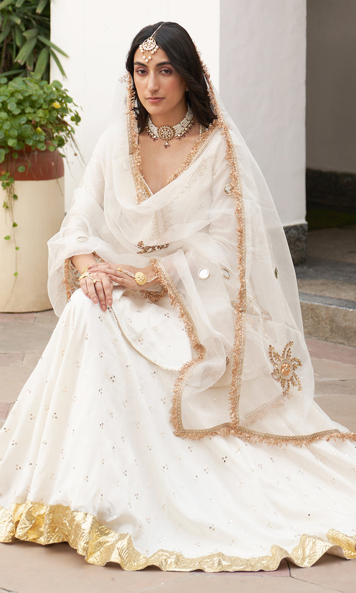 This set includes mukaish chnaderi lehenga with kurta and dupatta . Mukaish Chanderi Kurta with gota- patti hand embroidery. Mukaish Chanderi Lehenga with Gota lace finishing. Organza Dupatta with intricate Gota and Mirror hand embroidery finishing.