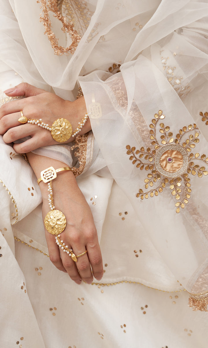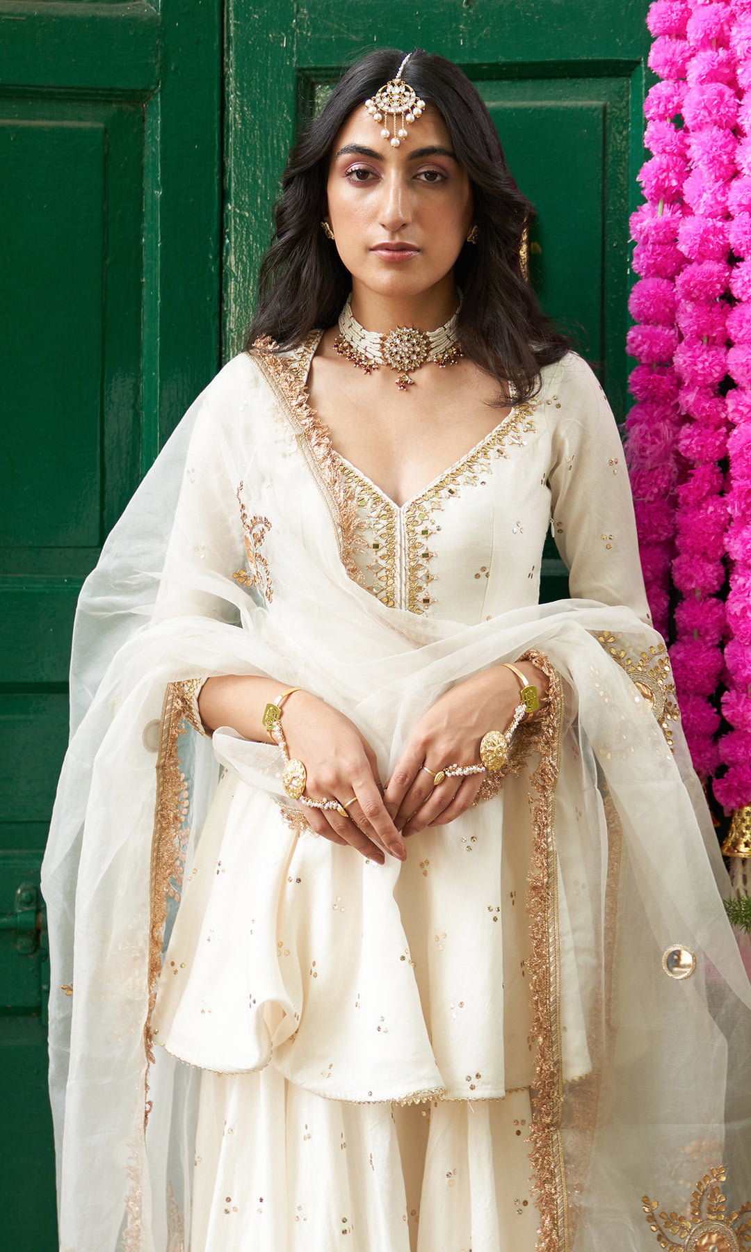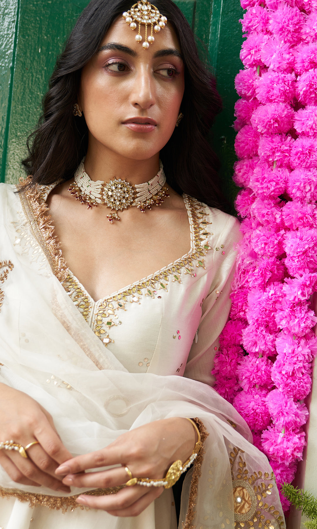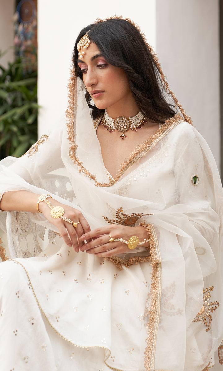 This set includes mukaish chnaderi lehenga with kurta and dupatta . Mukaish Chanderi Kurta with gota- patti hand embroidery. Mukaish Chanderi Lehenga with Gota lace finishing. Organza Dupatta with intricate Gota and Mirror hand embroidery finishing.