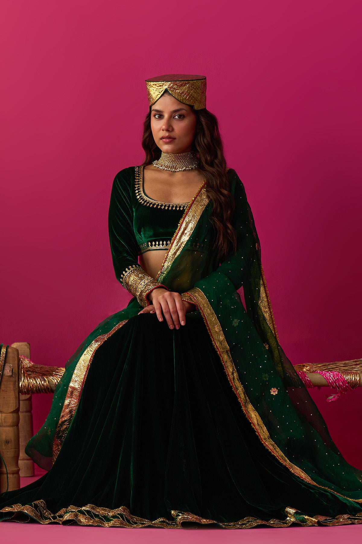 Nur green silk velvet green embroidered lehenga with blouse and dupatta (set of 3)