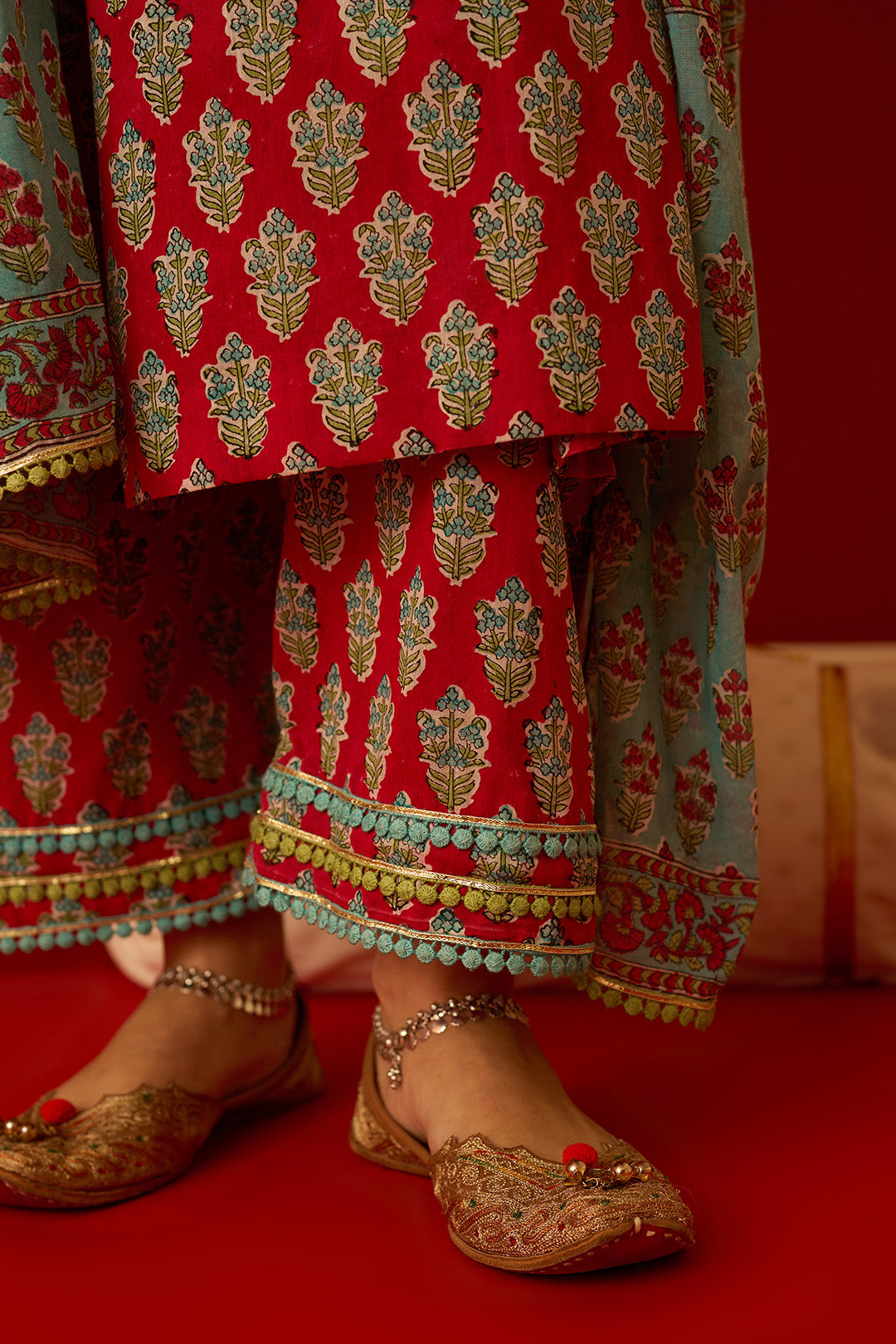 This set includes a block printed kurta paired with palazzo and a dupatta. All set is detailed with lace.