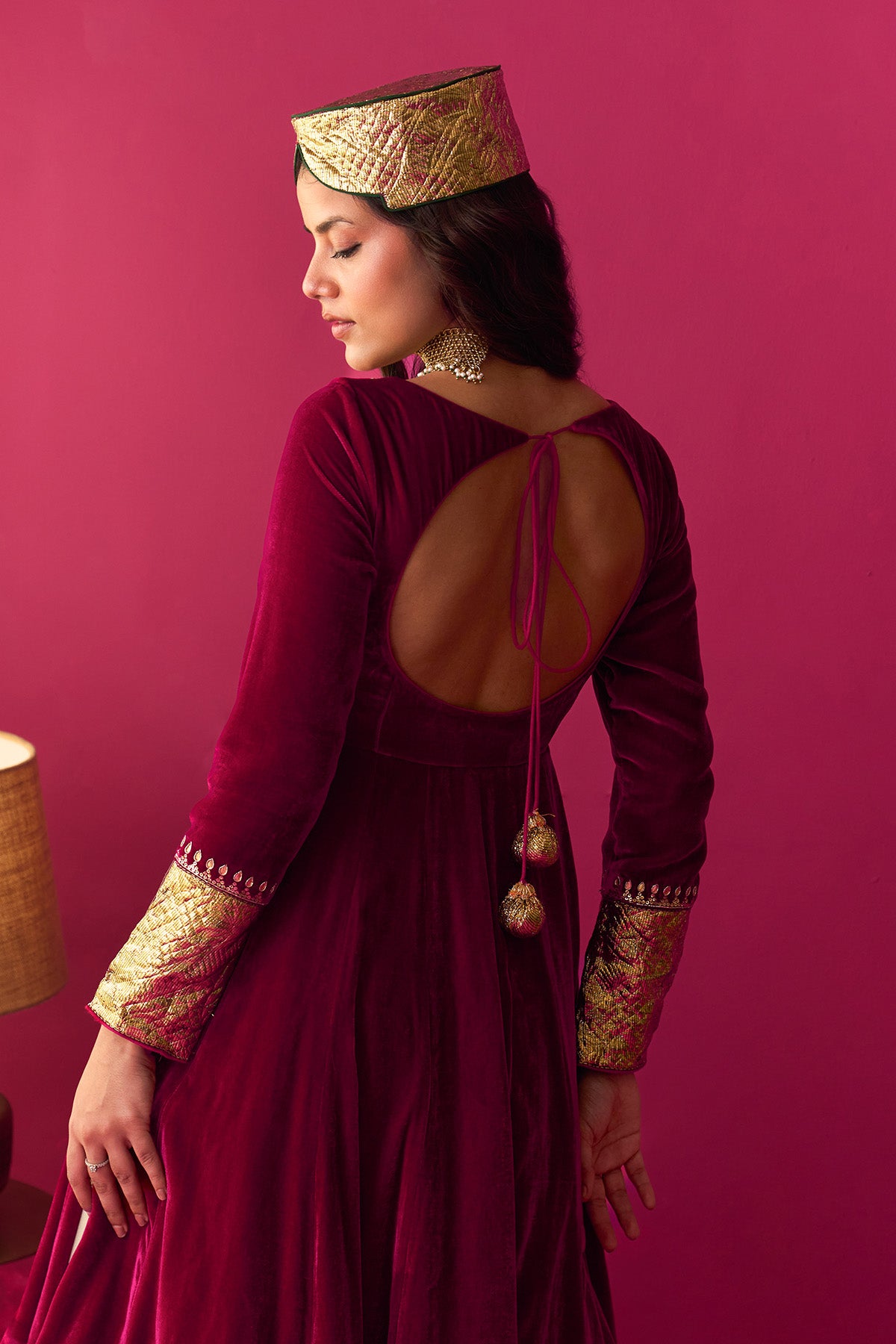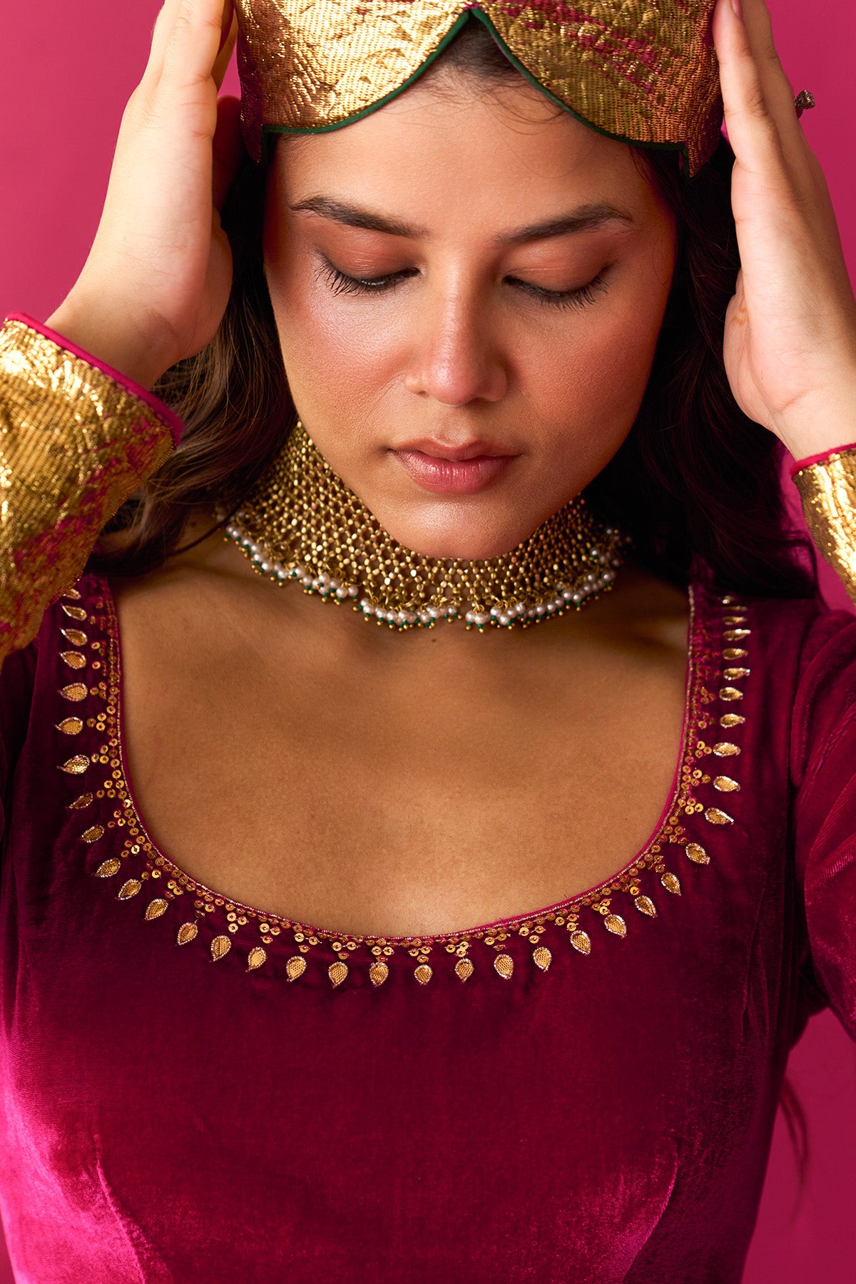 • FABRIC USED: Kurta - Silk Velvet Lining - Shantoon , Lehenga - Ivory Tissue , Lining Satin , Shawl - Silk Velvet