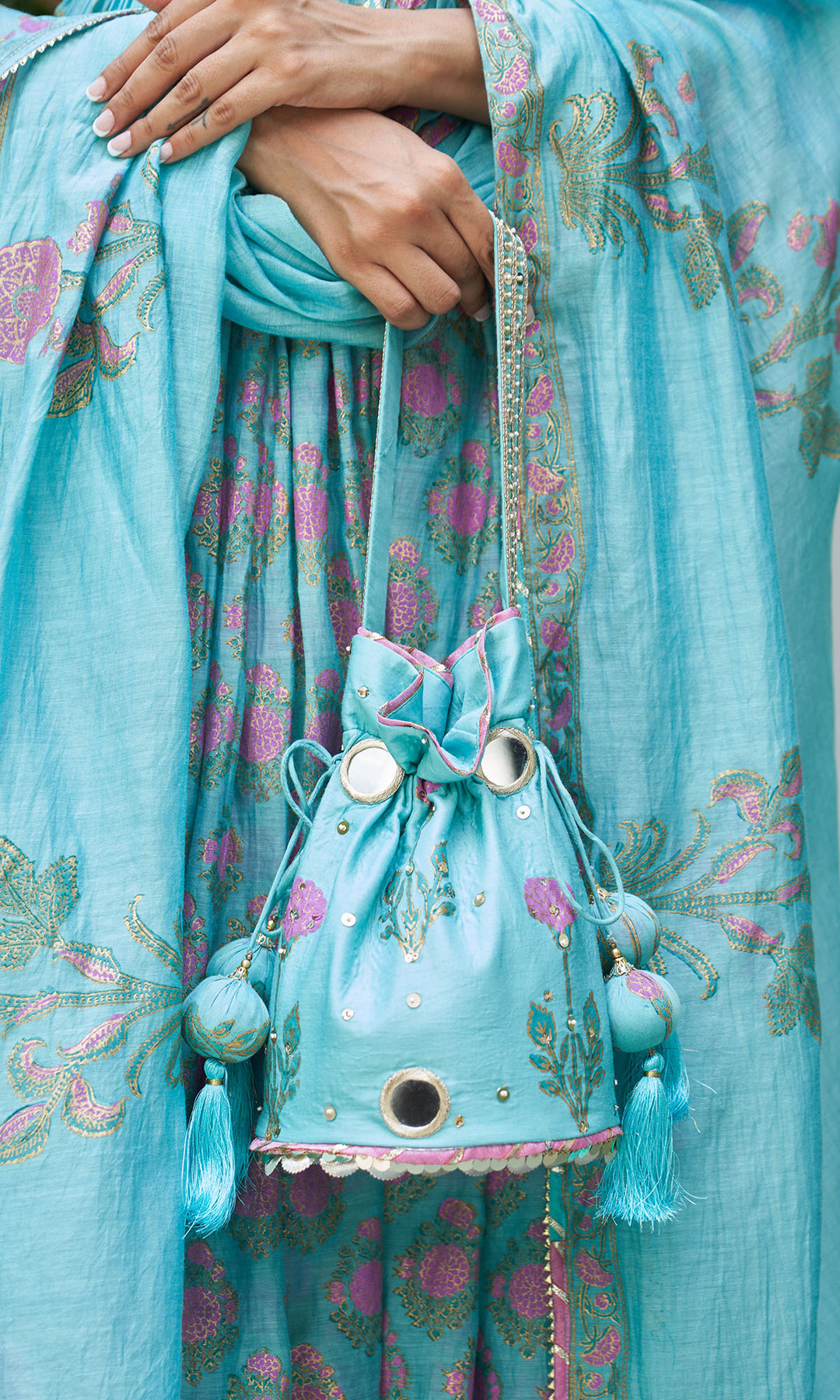 Ulfat Arctic Blue Lehariya Mirror embroidered Potli