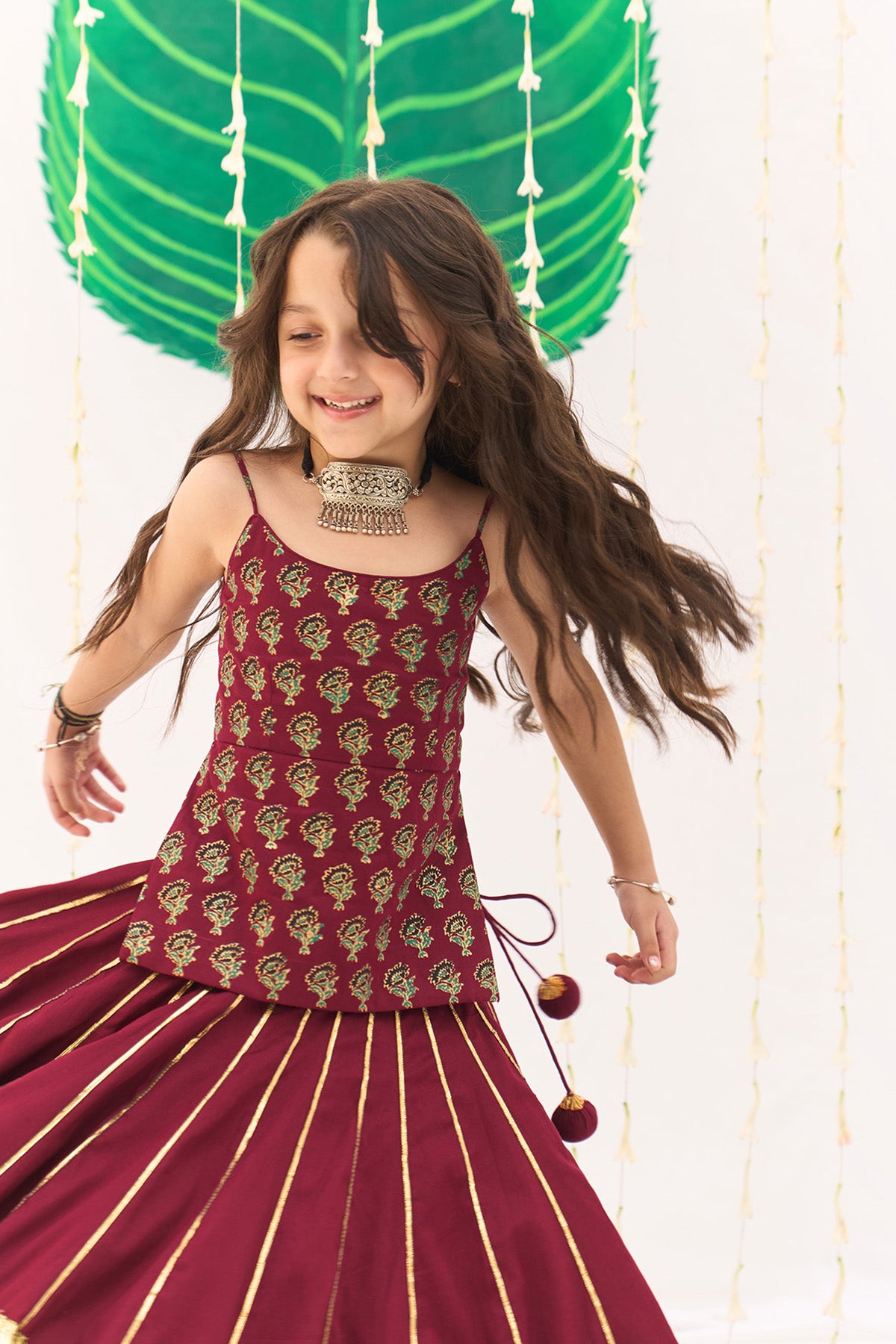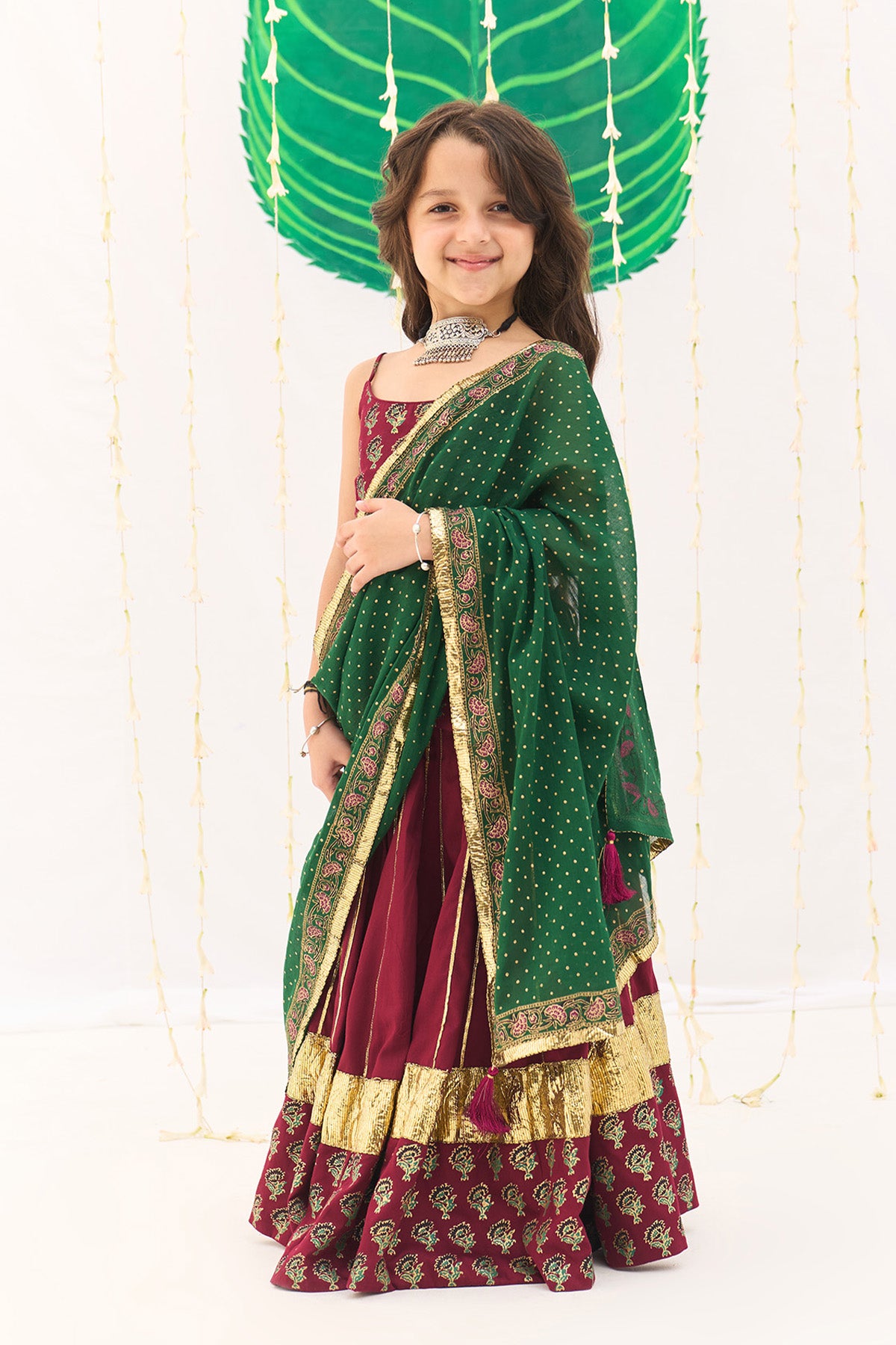 Jameela Berry Red Lehenga with Strap Choli and Green Dupatta (set of 3)