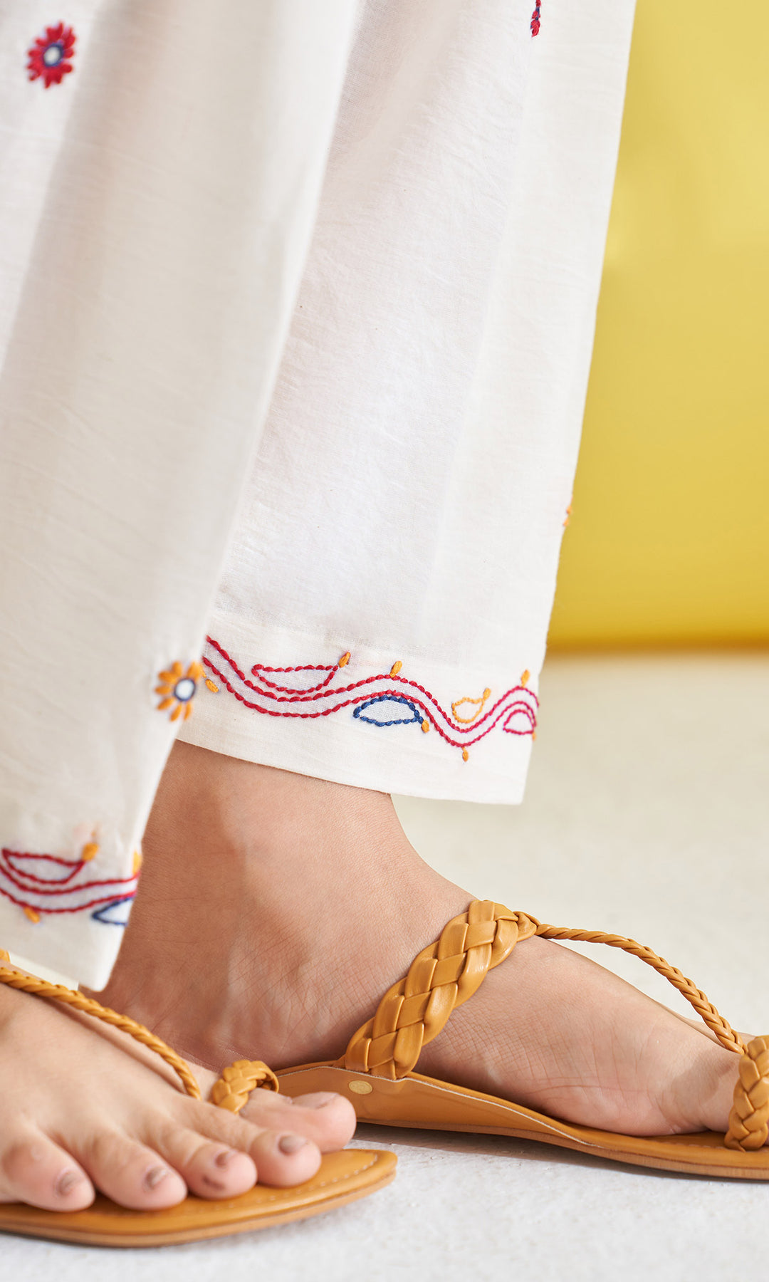 This set includes a short kurta with floral chikankari hand embroidery paired with a matching salwar with embroidery details near the hem.