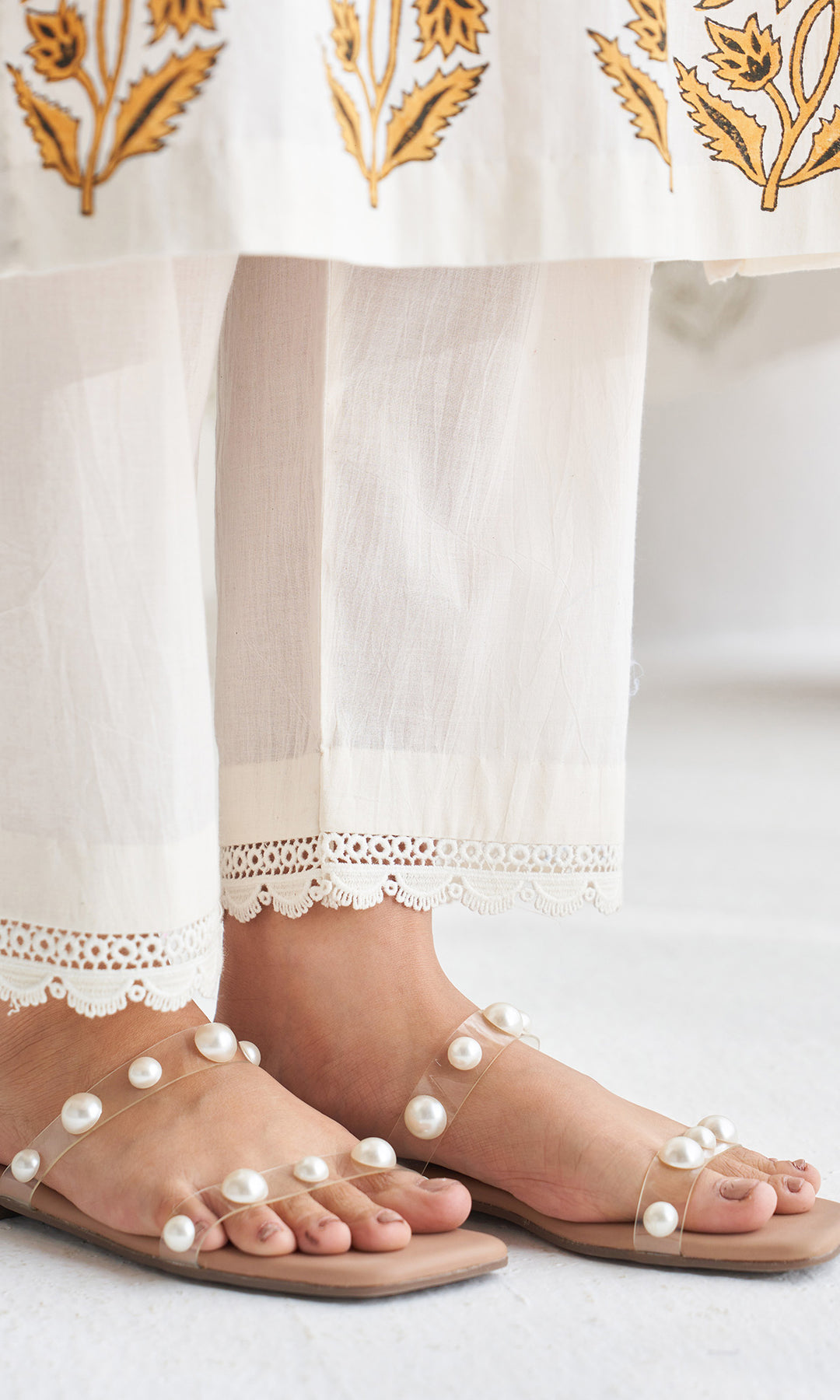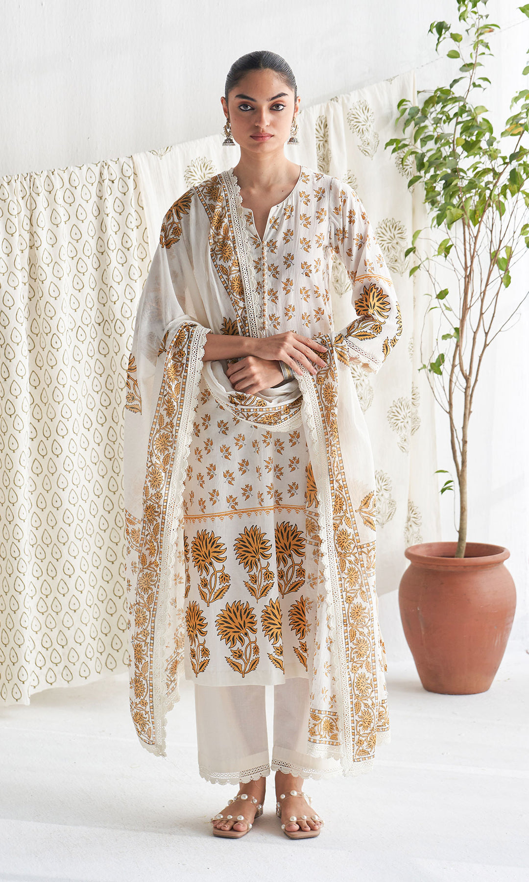 This set includes a block printedstraight kurta with front showbuttons and lace details on thesleeves, paired with a palazzo havinglace details on the hem and amatching block printed dupattafinished with lace