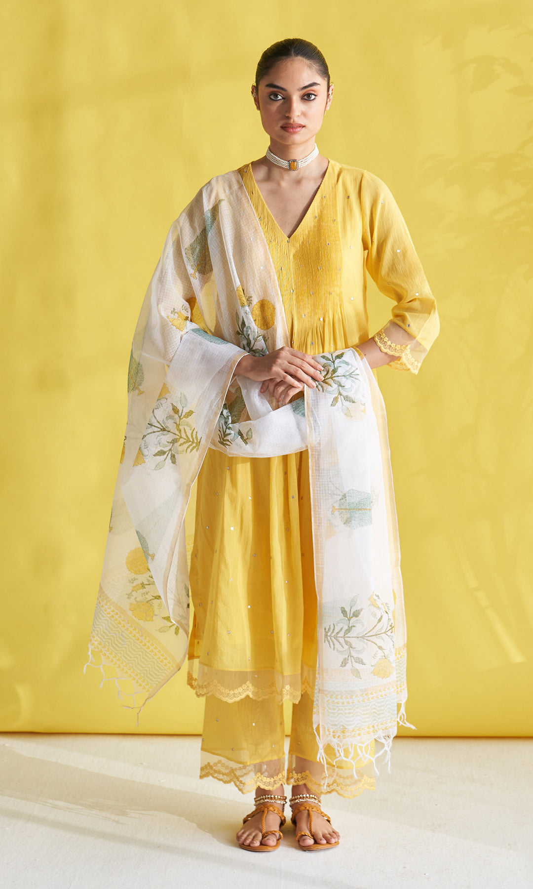 This set includes a V neck pintuck kurta set with organza lace details on the sleeves and hem paired with a matching palazzo with organza lace details on the hem and a floral block printed dupatta.