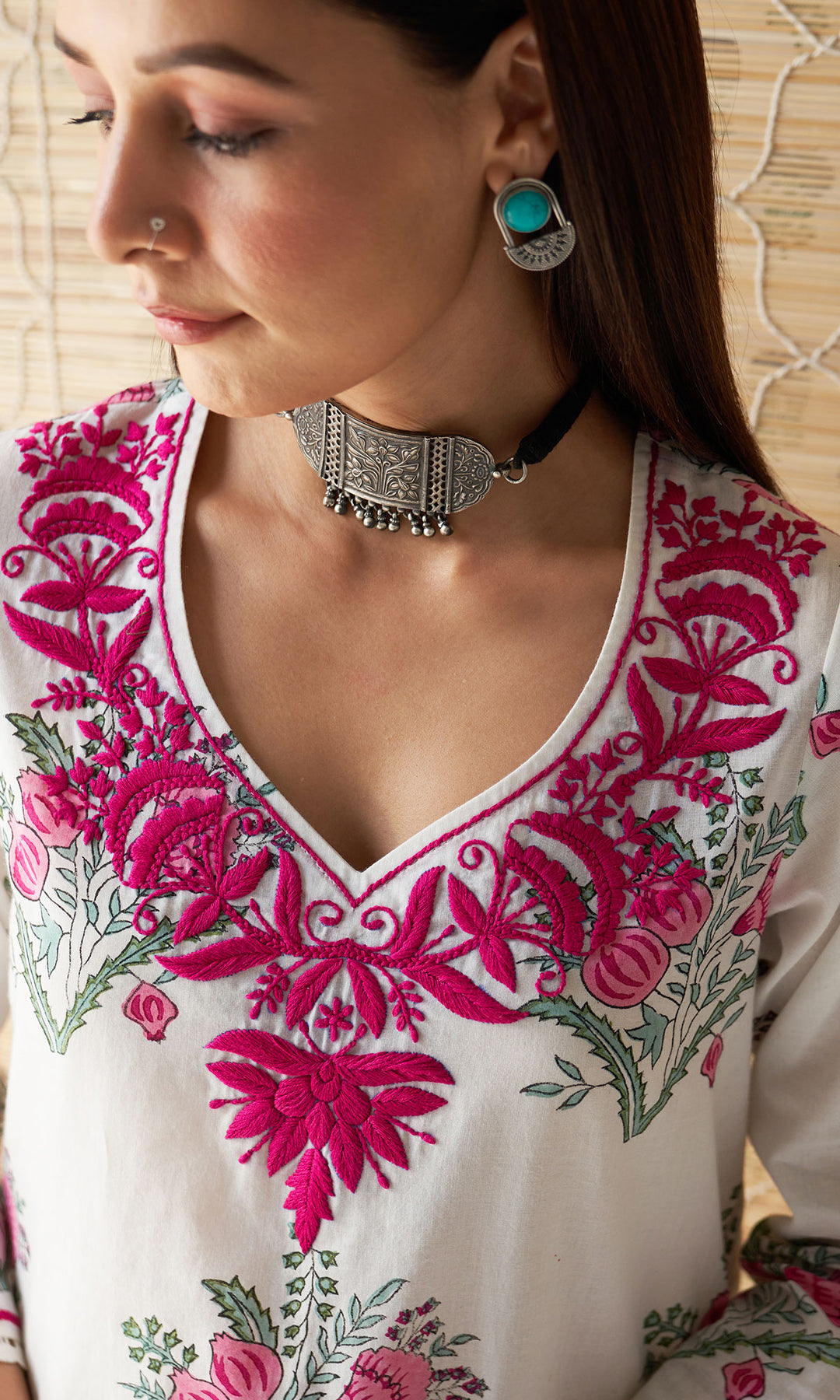 This set includes chikankari embroidered block printed kurta with palazzo. Block printed dupatta is finish with lace.
