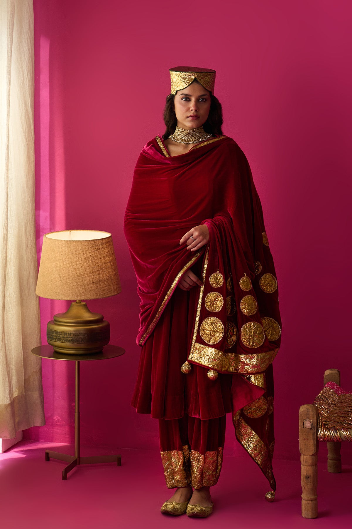 This set includes kalidar kurta with salwar both are detailed with gota lace . Shawl is beautifully detailed with gota machine and hand embroidery .